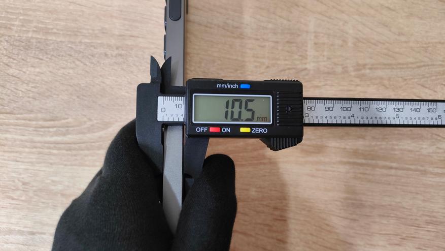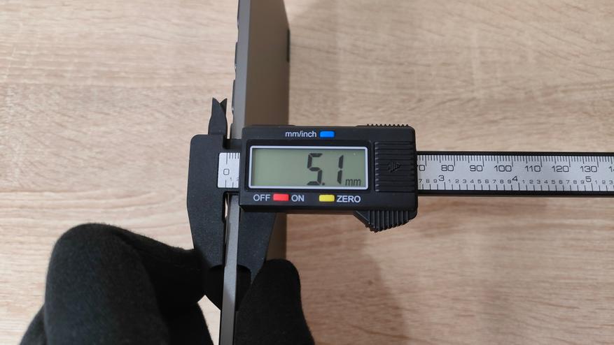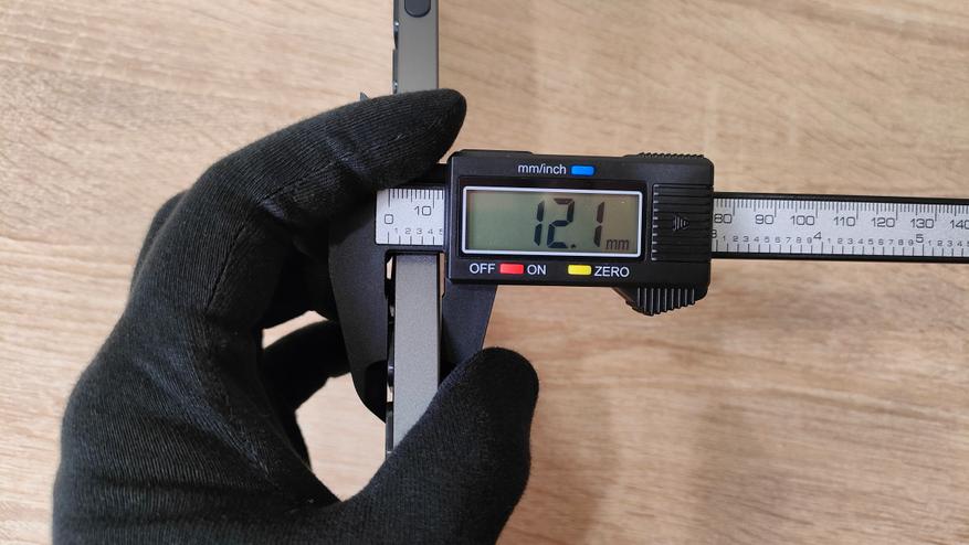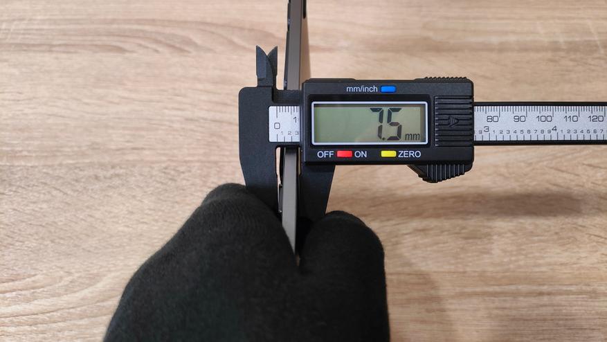 Как-то определить профиль колпачков, скорее всего, не представляется возможным, наверное, какая-то и собственная разработка и какая-то смесь разных профилей, в том числе и ноутбучных, поэтому можно как-то обобщить — тонкий. Ещё на всех клавишах есть углубление, кроме нижнего ряда, у него наоборот выпуклость. Толщина клавиатуры в самом тонком месте 5.1 мм, с клавишей 7.5; в самом толстом месте 10.5 мм с клавишей 12.1. Как видно даже в самом толстом месте с клавишей толщина абсолютно недостижимая для механической клавиатуры в самом тонком месте без учёта клавиши.