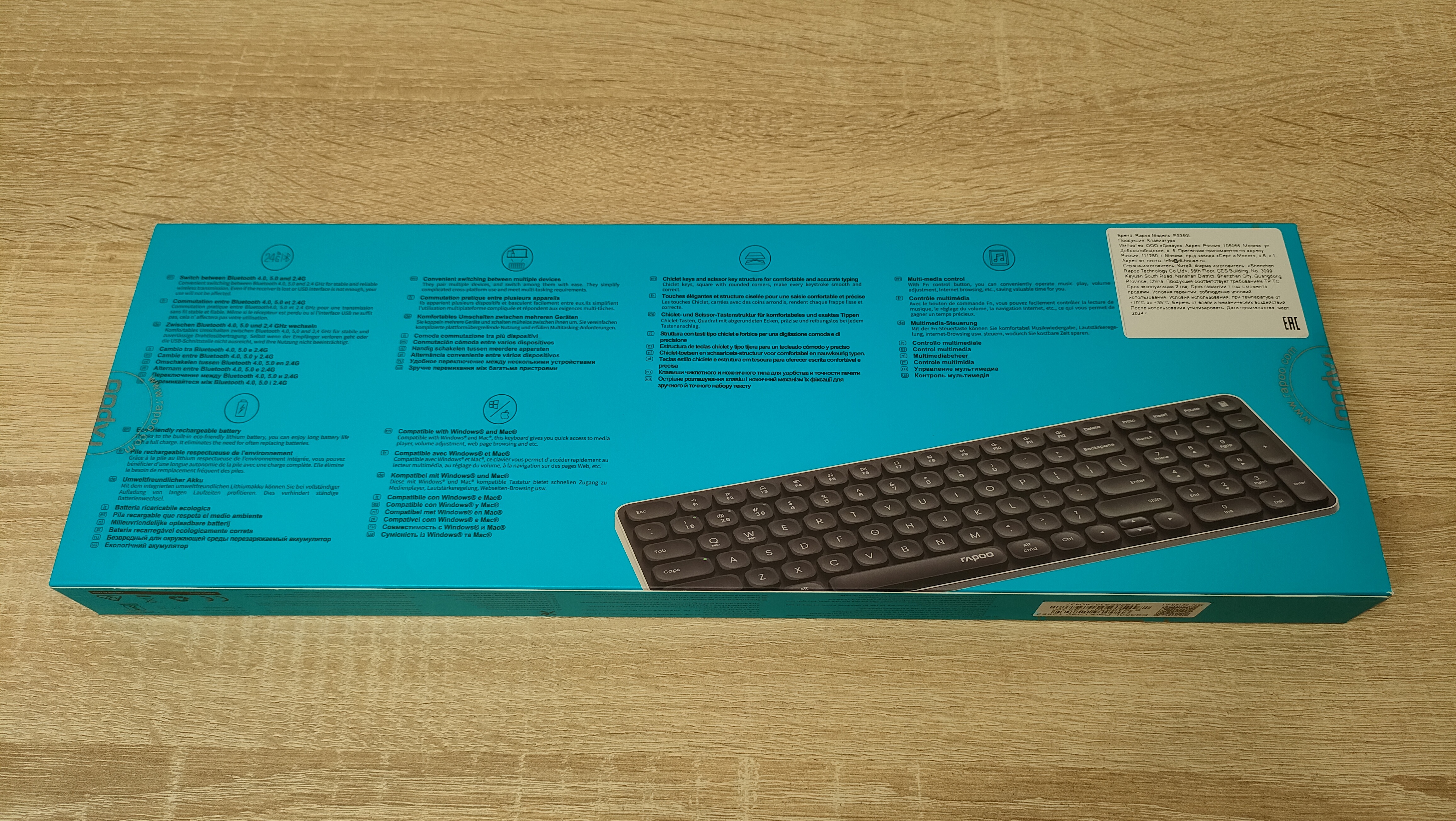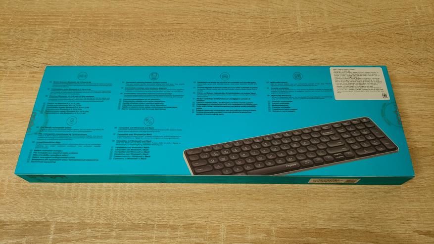 На упаковке из полезного лишь изображения клавиатуры, полный артикул, а наоборот и перечислены некоторые особенности, например, несколько режимов работы, а также указание ножничного механизма.