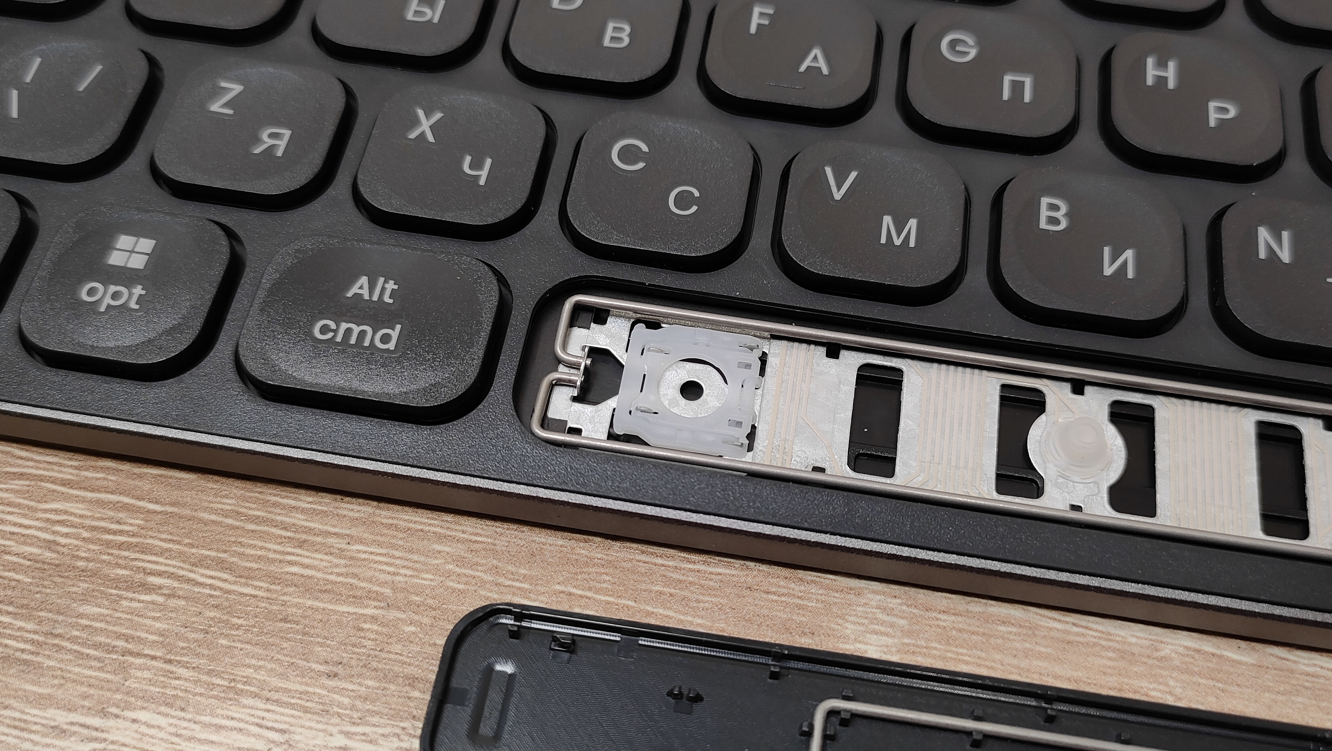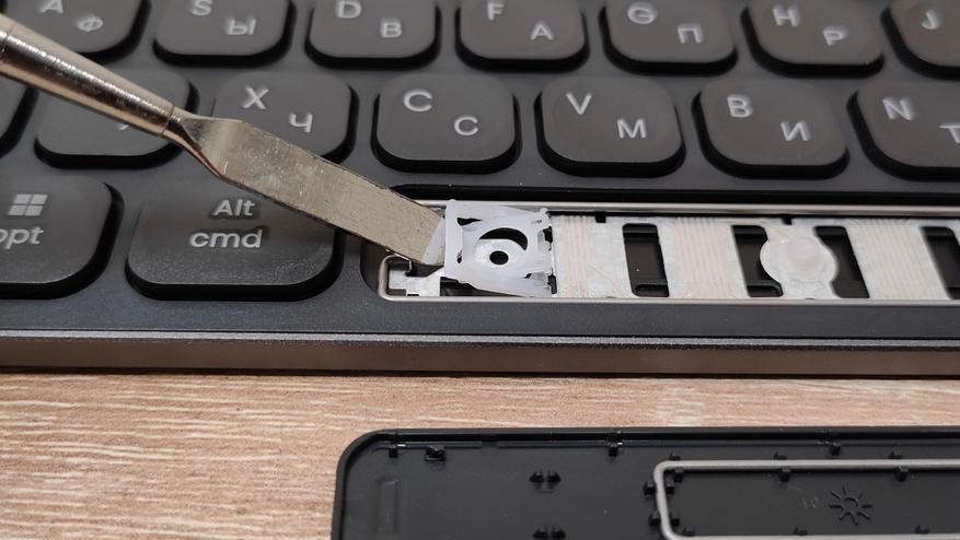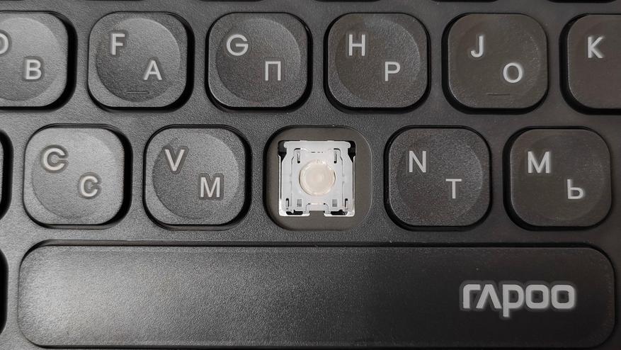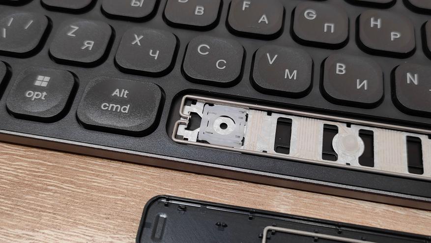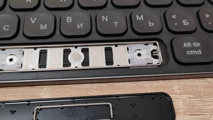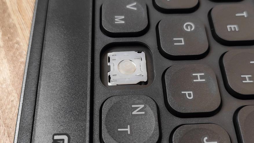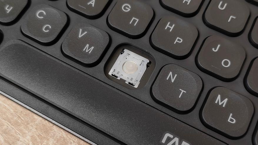 Сняв колпачок, сразу обнаруживается знакомый механизм ножничного типа, тот же самый, что используется в подавляющем большинстве ноутбуков. У пробела есть система стабилизации в виде двух скоб примерно точно такая же, как и в случае ноутбуков. Они очень хорошо удерживают клавиатуру на месте, защищают от перекосов и стараются при нажатии опустить всю клавишу. Но очень часто у них есть негативный эффект — они дребезжат.