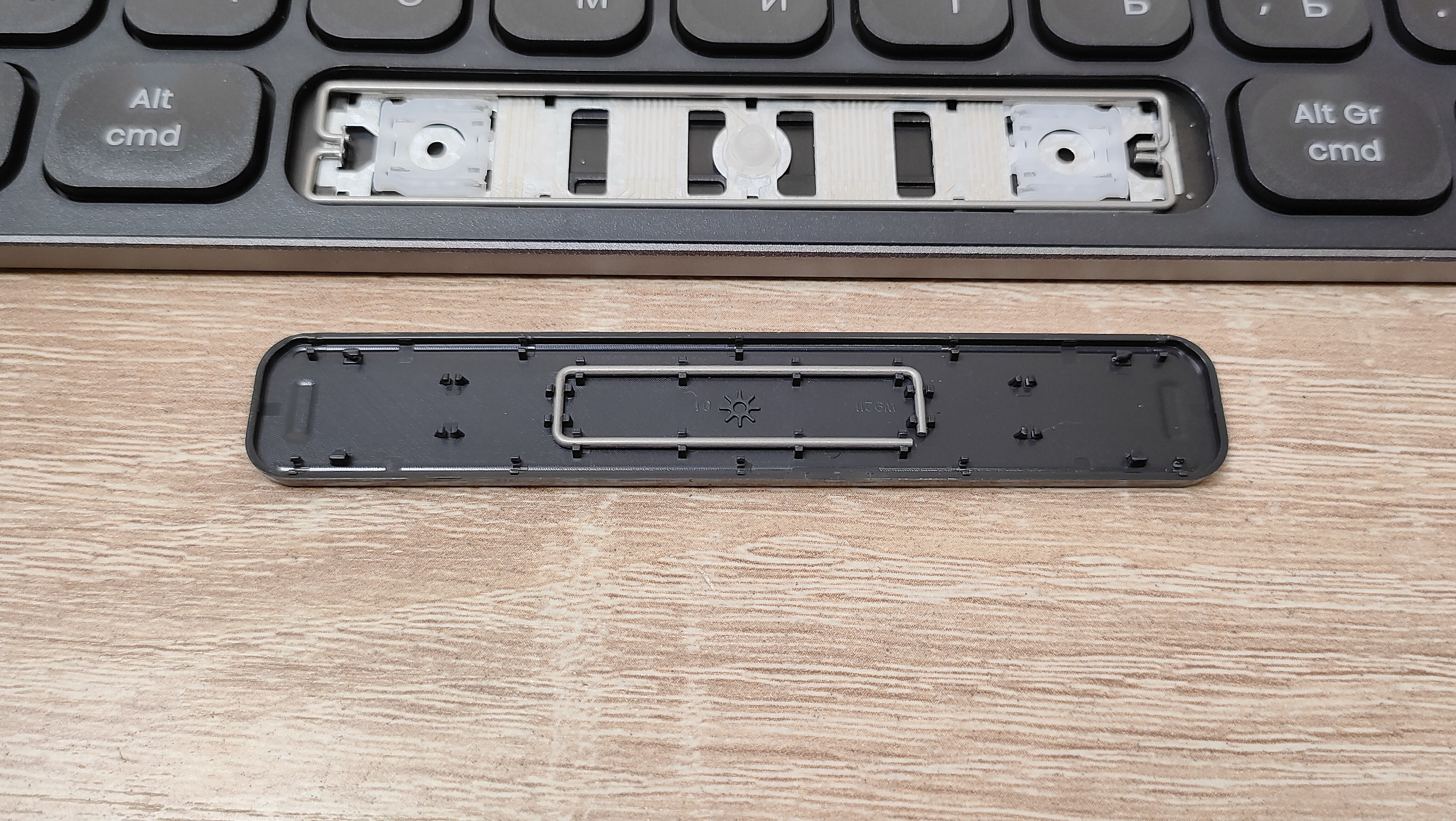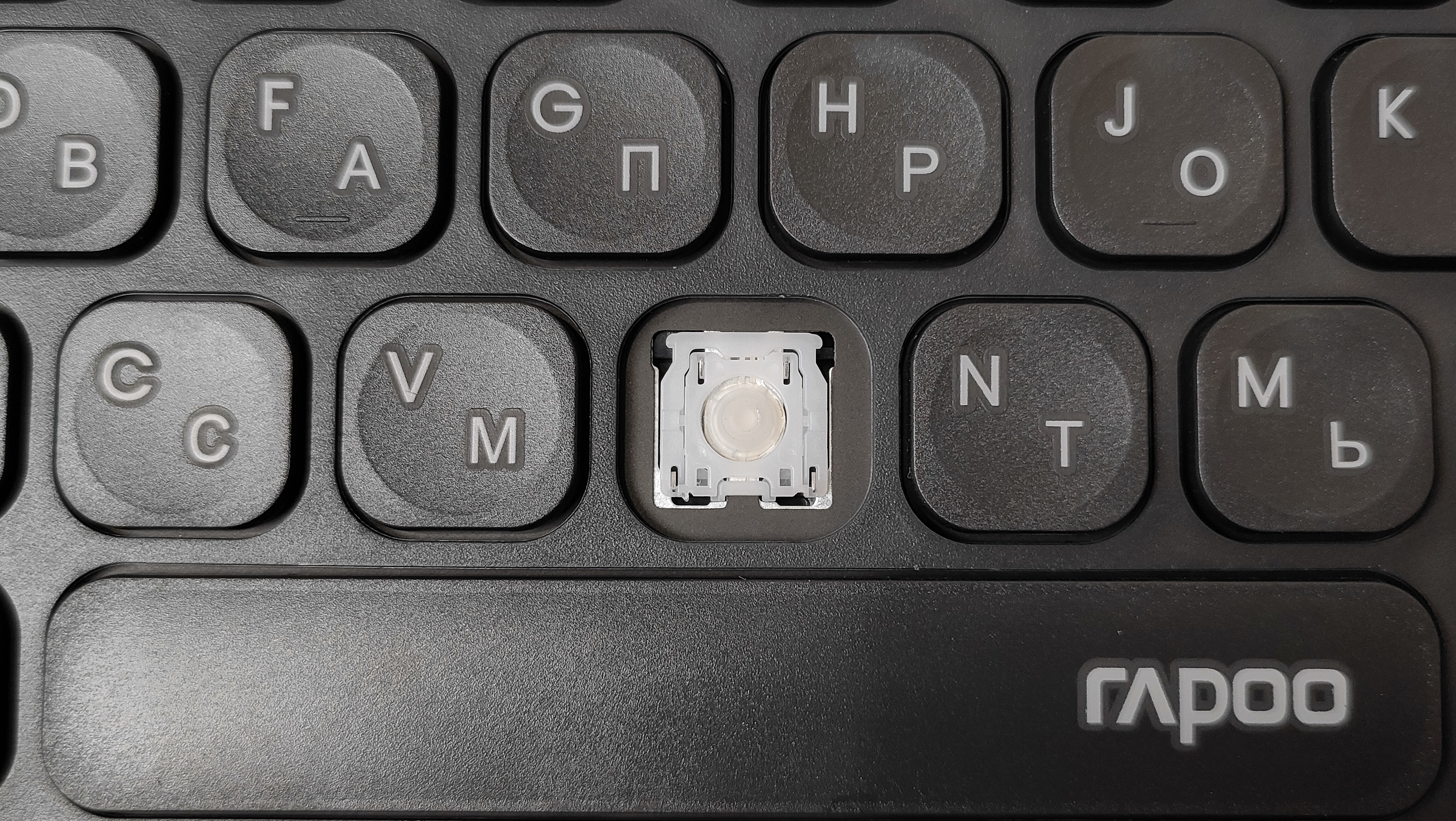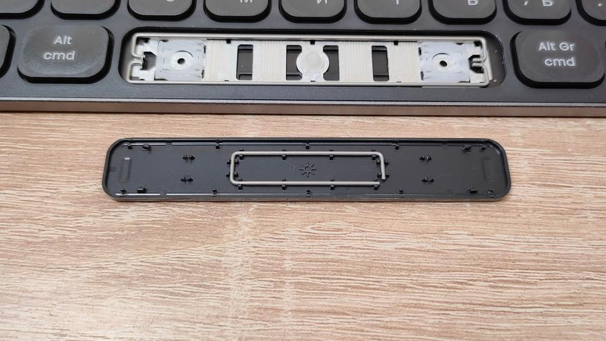 Сняв колпачок, сразу обнаруживается знакомый механизм ножничного типа, тот же самый, что используется в подавляющем большинстве ноутбуков. У пробела есть система стабилизации в виде двух скоб примерно точно такая же, как и в случае ноутбуков. Они очень хорошо удерживают клавиатуру на месте, защищают от перекосов и стараются при нажатии опустить всю клавишу. Но очень часто у них есть негативный эффект — они дребезжат.