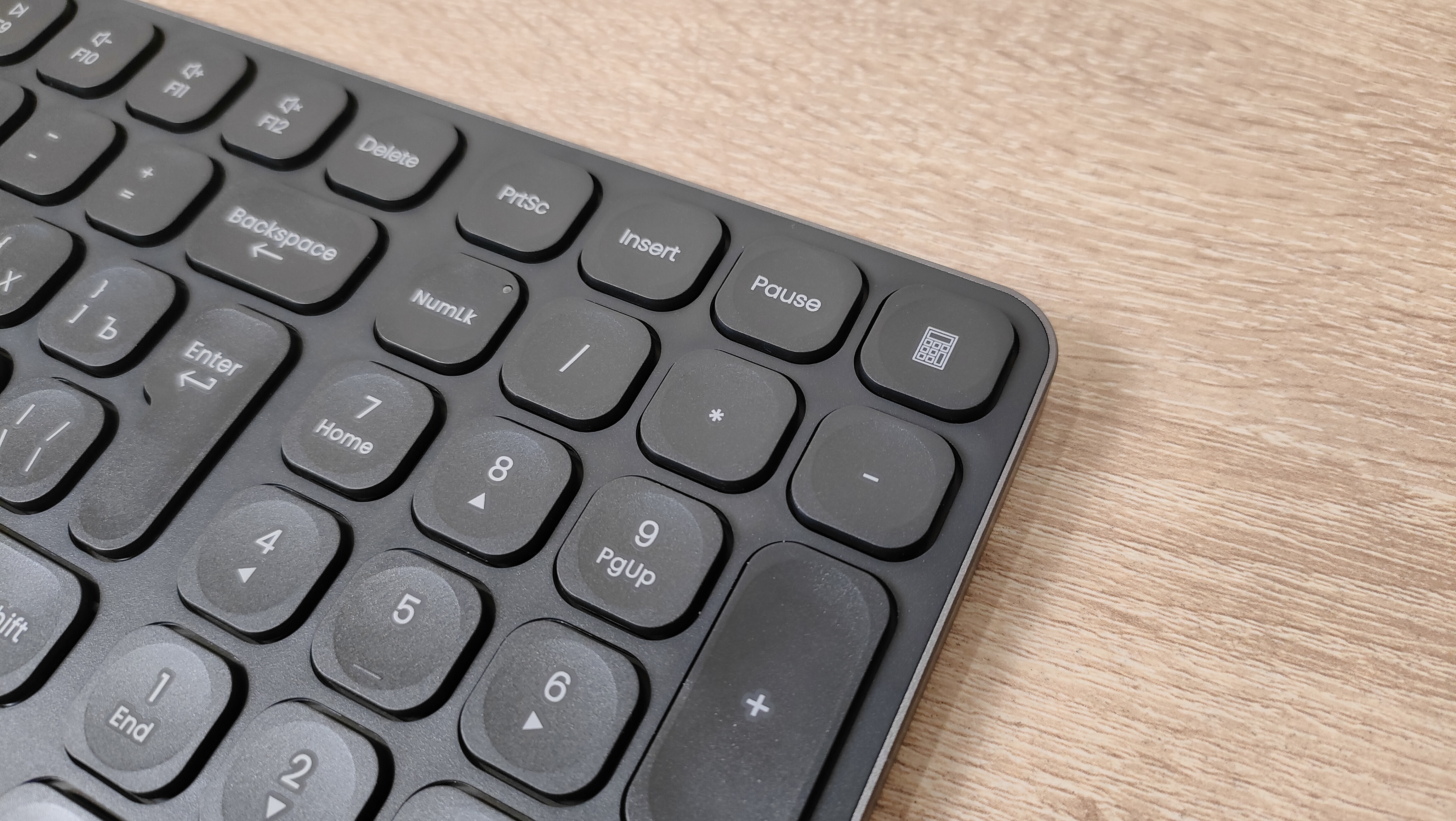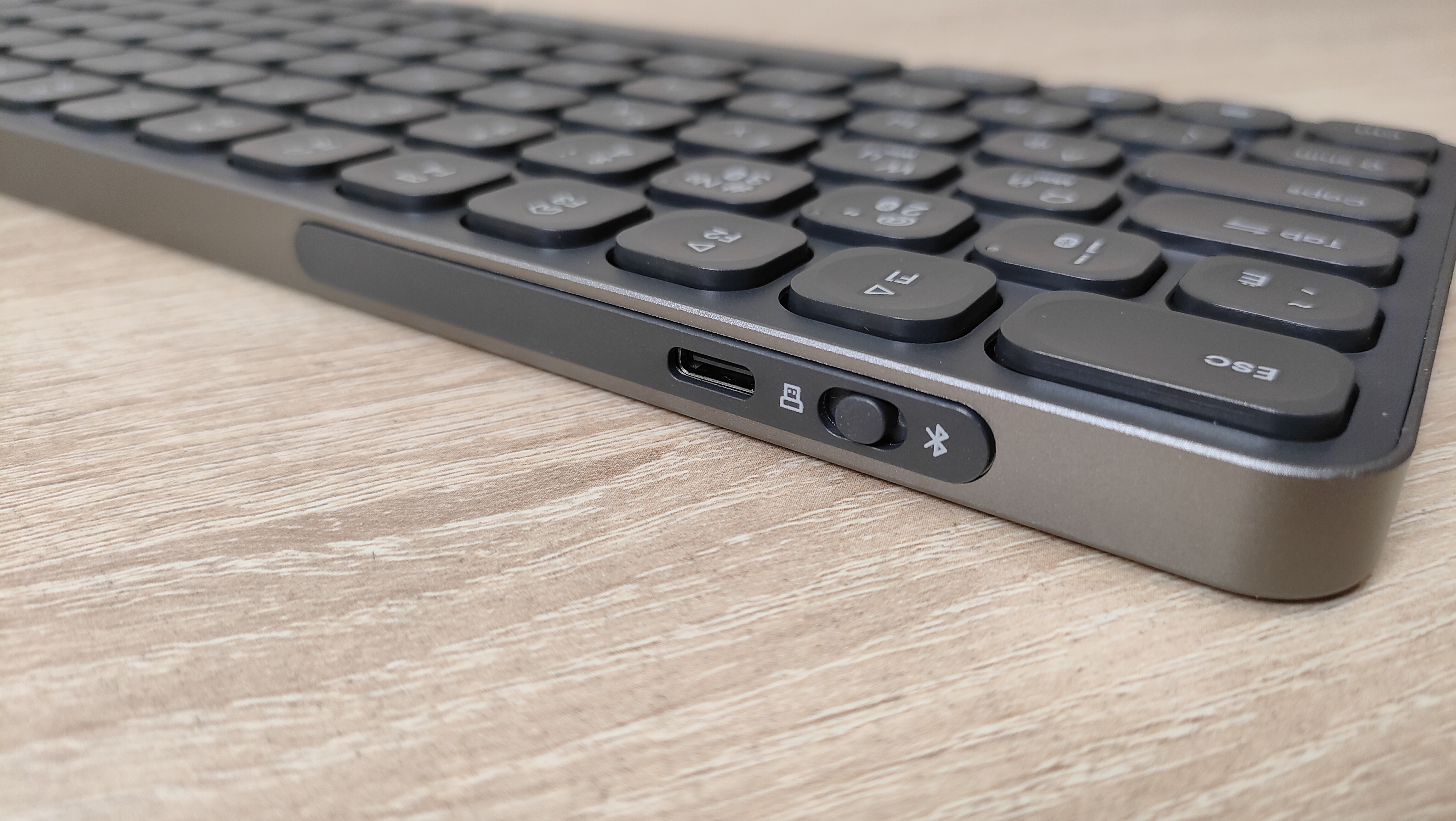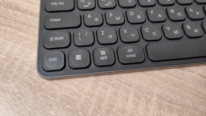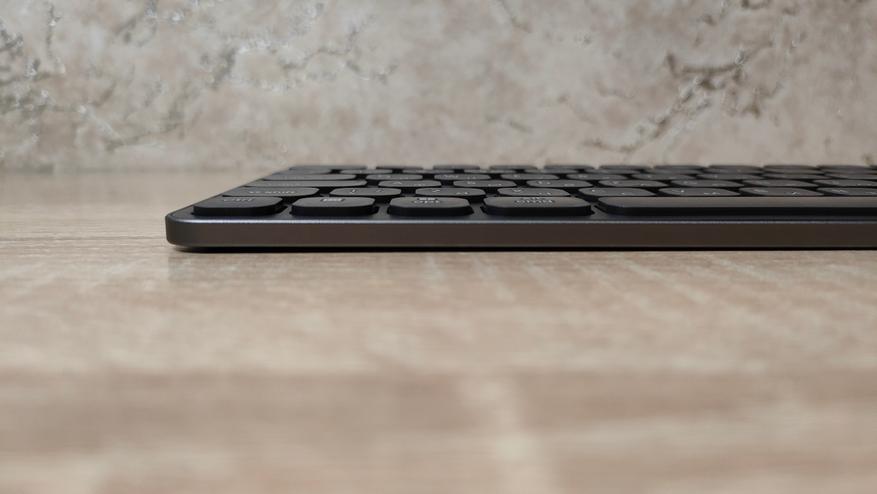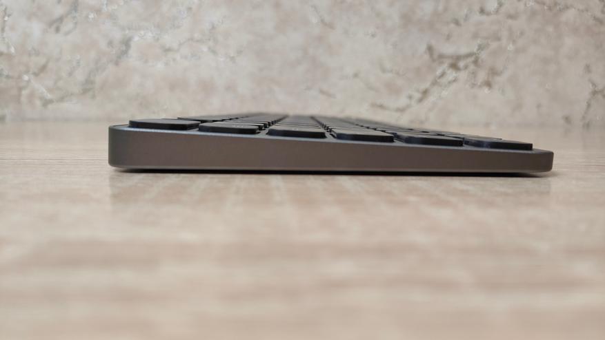 С одной стороны ножничные клавиатуры все очень сильно друг на друга похожи и ещё они на ноутбучные. Примечательным является тот факт что для корпуса использован алюминий, что придаёт жёсткость всей конструкции, в результате чего она очень плохо скручивается, а значит эффект достигнут. Дизайн у клавиатуры максимально нейтральный, все клавиши имеют очень сильное скругление, но прямоугольная форма всё равно прослеживается. На тыловом торце есть небольшая вставка, где находится переключатель режимов работы, а также порт USB type-c для зарядки и подключения.