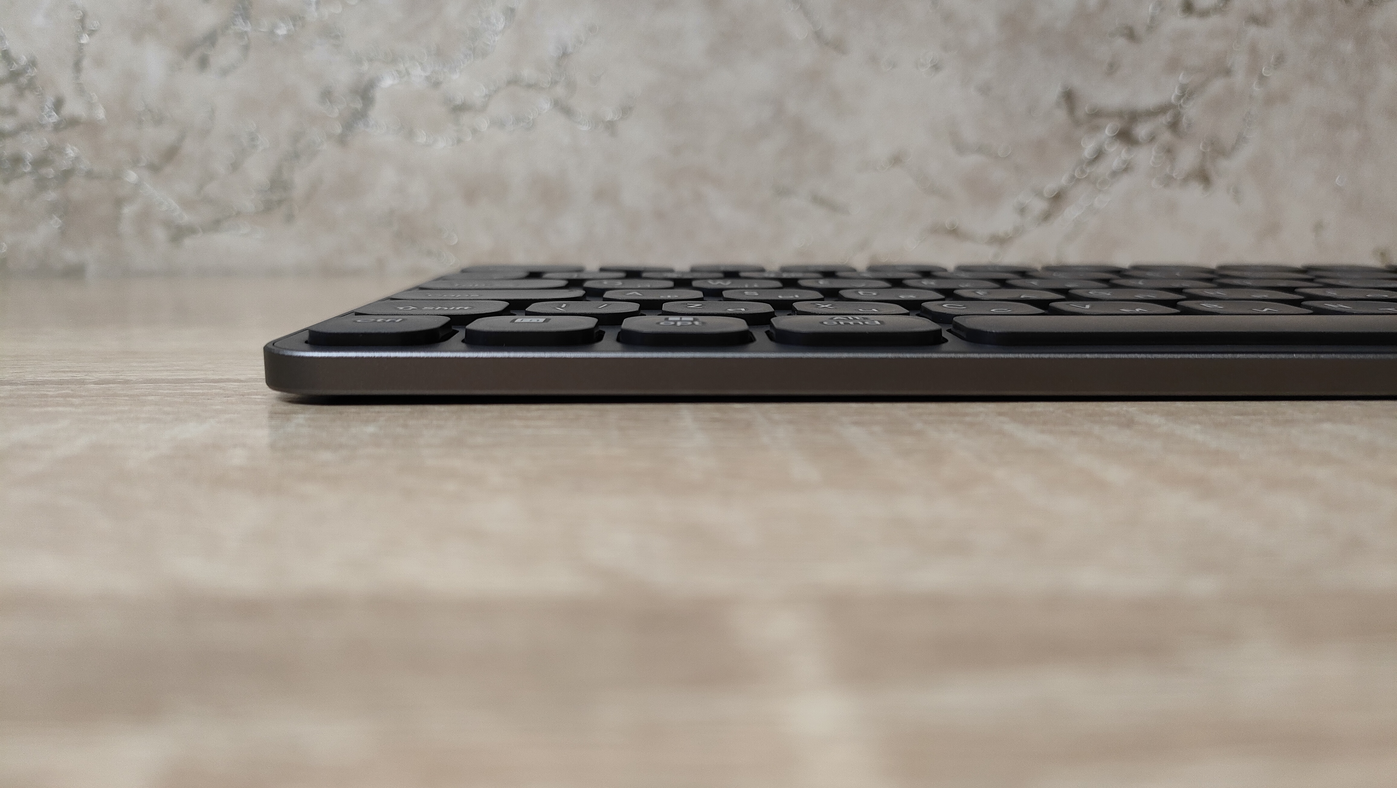 В работе клавиатура себя ведёт абсолютно так же как и любая ножничная или ноутбучная. Но вся суть её в очень малой толщине, работаешь, будто просто положив руки на стол, ощущение необычное и в то же время очень даже хорошее, потому что сгибать руки не приходится как в случае с классической механической клавиатурой, которым периодически нужно или подставку брать для запястий, либо делать гимнастику. Все клавиши отрабатывают полностью нормально и не вызывают каких-то негативных эмоций, кроме пробела. Он, как и говорилось, слегка дребезжит, но это специфика стабилизаторов они практически всегда дребезжат, но ещё если попробовать нажать совсем на левый или правый бок то иногда при очень мягком слабом нажатии клавиша может не сработать, при нажатии на четверть ближе к середине никаких проблем нет, но чем ближе мы нажимаем к середине, тем тяжелей нажимается клавиша. Такое поведение я наблюдал и на ноутбуках. Не скажу, что как-то особенно тяжело просто заметно, что усилия разные на краю и в центре. Это единственное, что обратило на себя внимание.