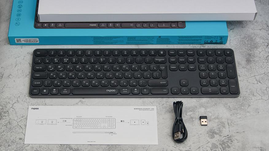 Набор включает саму клавиатуру, радиочастотный USB-приемник, кабель для подзарядки и пользовательскую инструкцию.