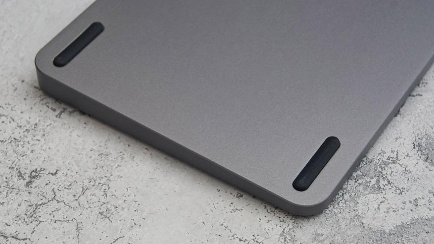 Нижняя часть корпуса изготовлена из цельного листа алюминия и напоминает своеобразный поддон, края которого плавно переходят в торцевые грани.