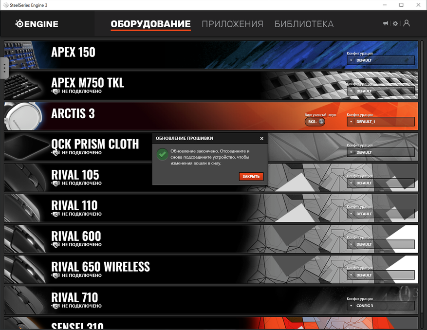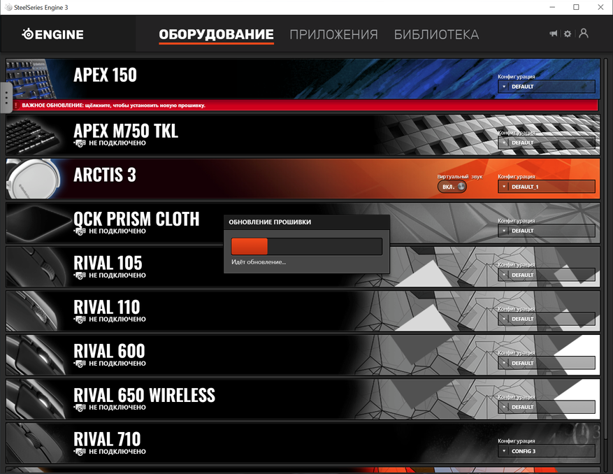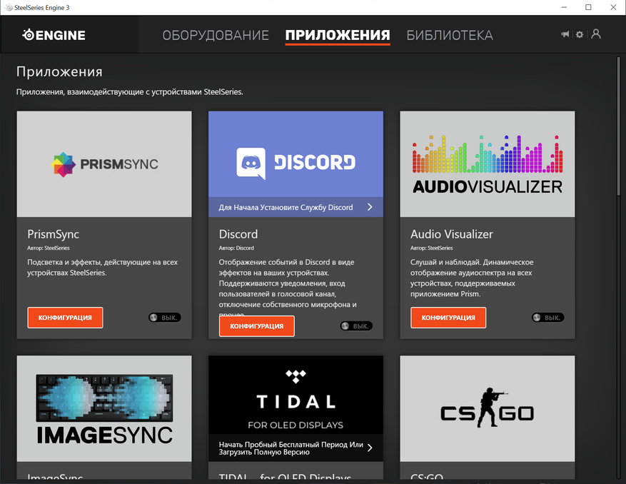 Запустив программу, в закладках мы можем видеть все подключенные или подключаемые ранее устройства этого бренда, можно получить доступ к полезным приложениям, в которых можно совершить настройку компьютерной периферии, а также установить связь с локальной игровой библиотекой. Преинтересной полезностью можно считать возможность хранить уникальные настройки своих устройств в облаке и при необходимости загрузить на любом компьютере с помощью SteelSeries CloundSync.