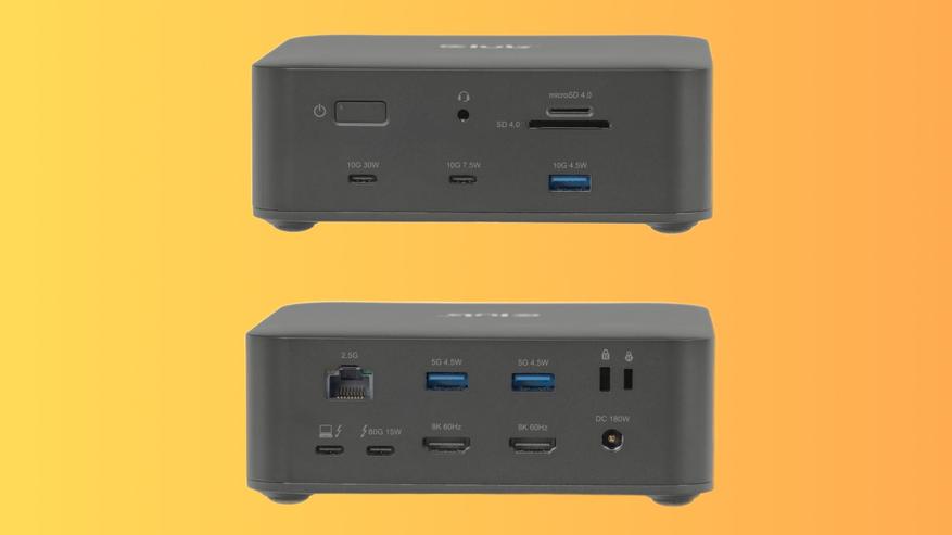На передней панели размещены 3,5-мм аудиоразъём, слоты для карт SD 4.0 и microSD 4.0, два USB-C (10 Гбит/с, 30 Вт и 7,5 Вт) и USB-A 10 Гбит/с. Задняя сторона включает Thunderbolt 5 — вход, Thunderbolt 5 — выход с поддержкой 15 Вт, два USB-A 5 Гбит/с, два выхода HDMI 2.1 FRL, 2,5-гигабитный Ethernet, а также стандартный и nano Kensington-замок.