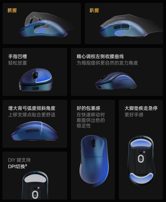 Корпус разработан для пользователей с маленькими и средними ладонями. Эргономика устройства предусматривает совместимость с когтевым и ладонным типами хвата благодаря изогнутой форме, специальным выемкам для пальцев и увеличенным скользящим ножкам.