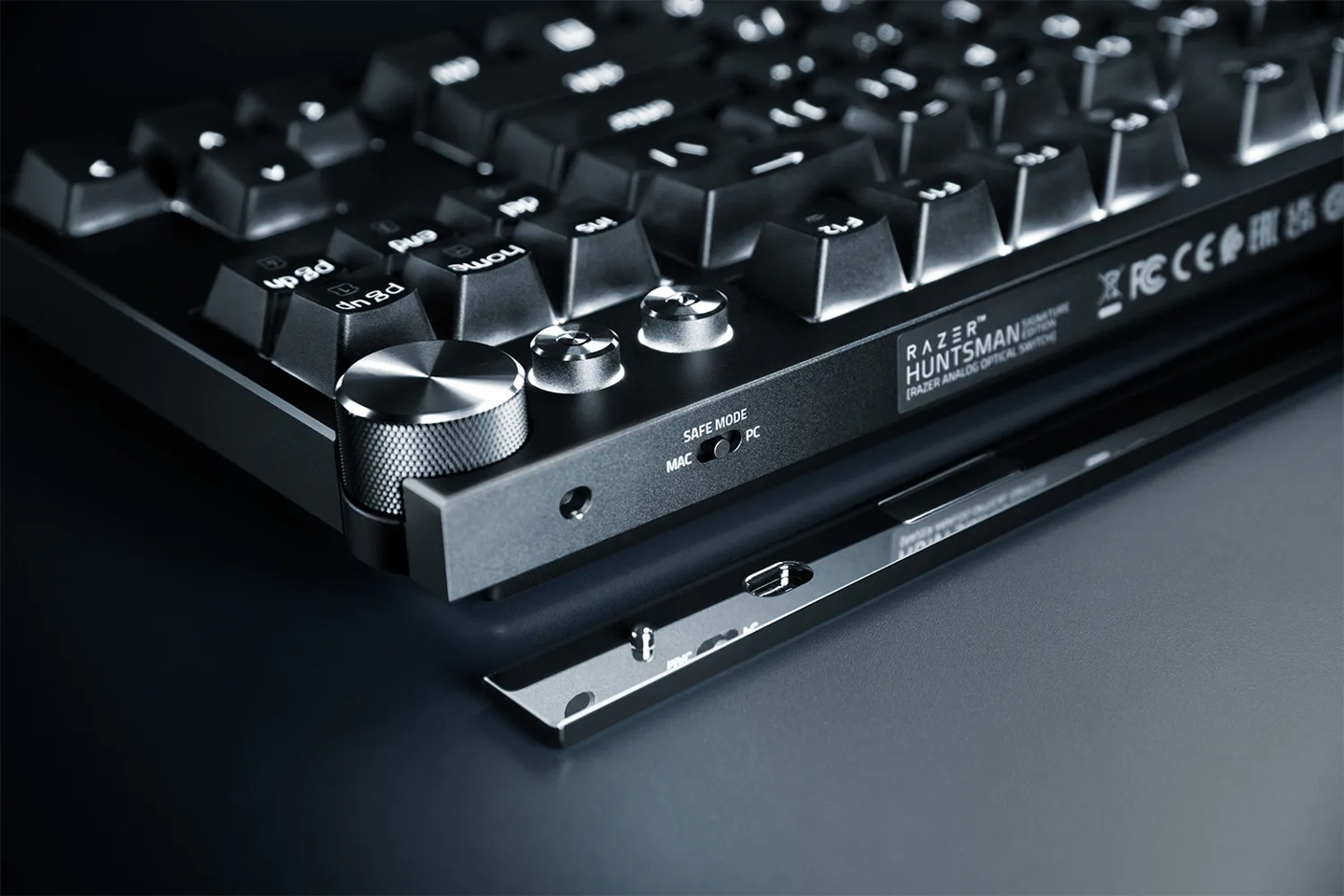 В Huntsman Signature Edition установлены аналоговые оптические переключатели Razer второго поколения. Эти переключатели поддерживают регулируемую точку срабатывания и обеспечивают частоту опроса до 8000 Гц. Колпачки клавиш изготовлены из PBT-пластика методом двойного литья, что обеспечивает устойчивость надписей к истиранию.