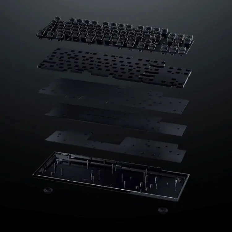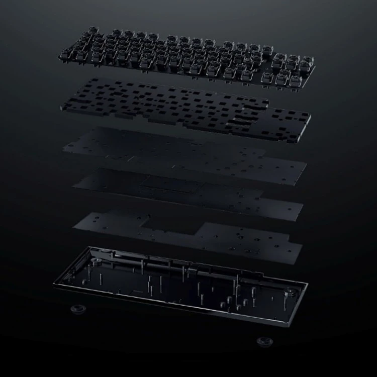 Внутренняя конструкция клавиатуры включает многослойную структуру на основе текстолита FR4 и пены EVA. Дополнительно установлена шумоподавляющая подкладка из веганской кожи, которая снижает резонанс корпуса и формирует более плотное звучание при нажатии клавиш.