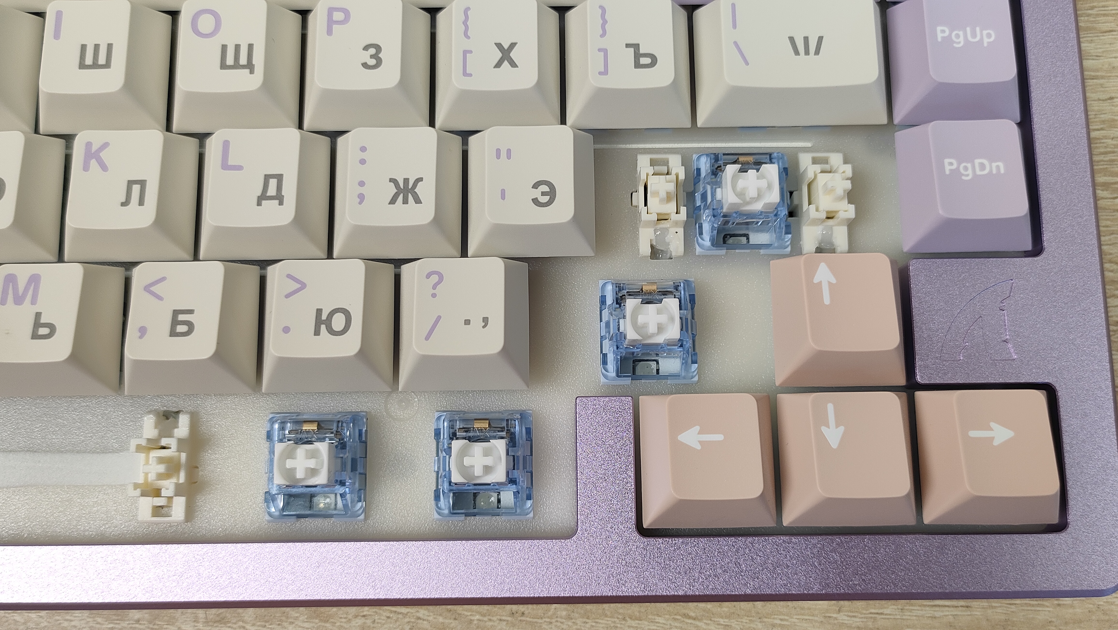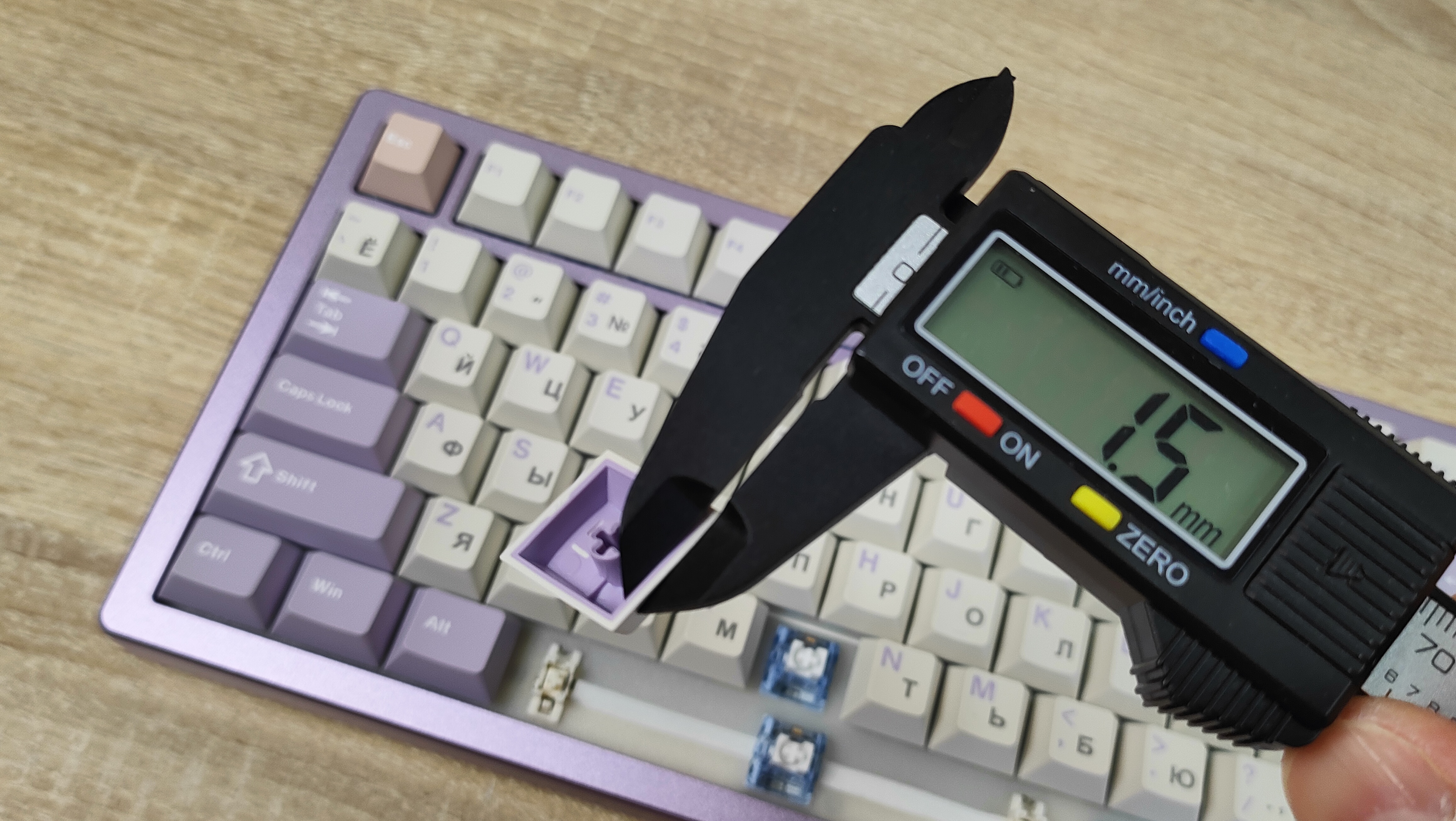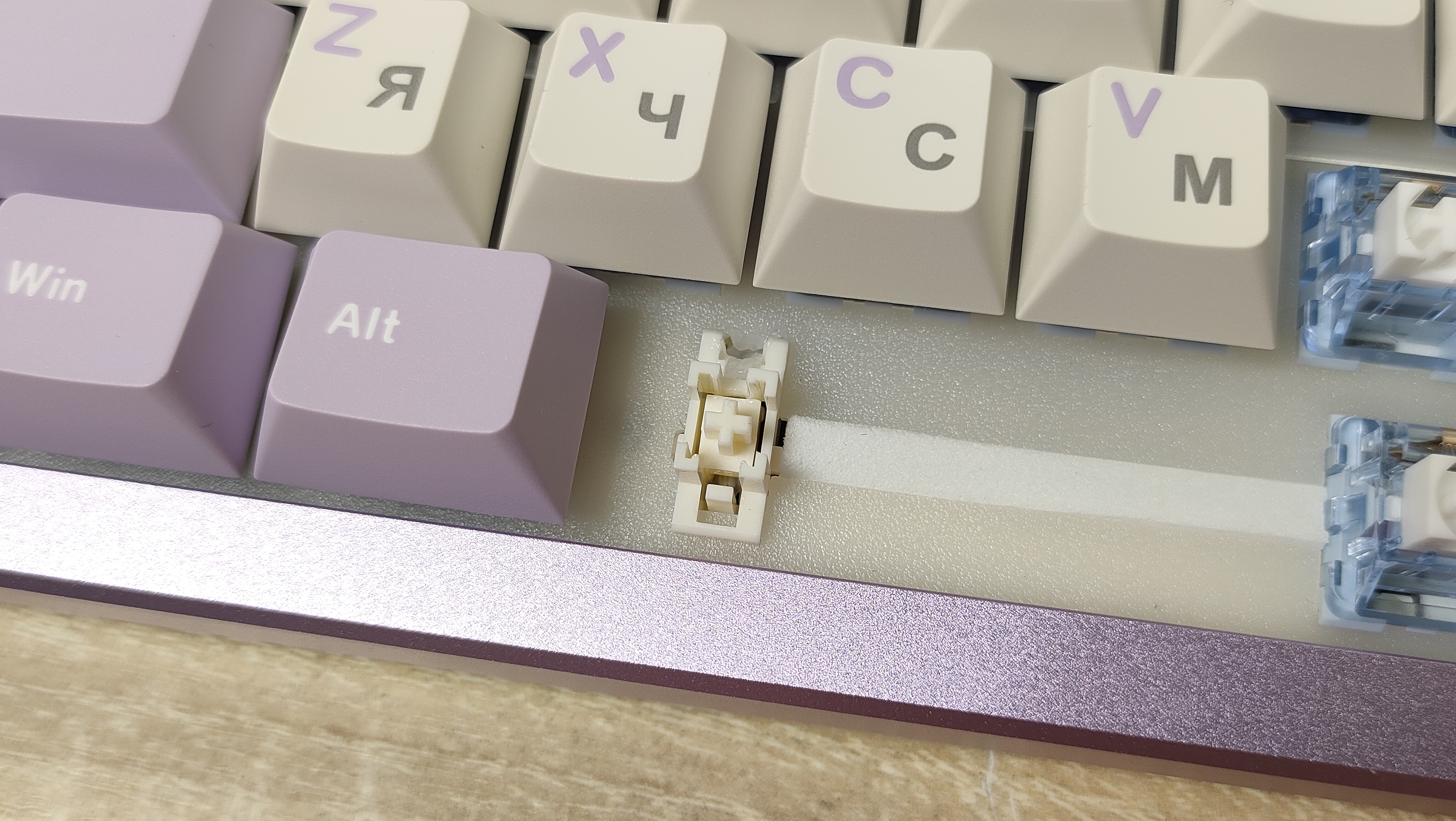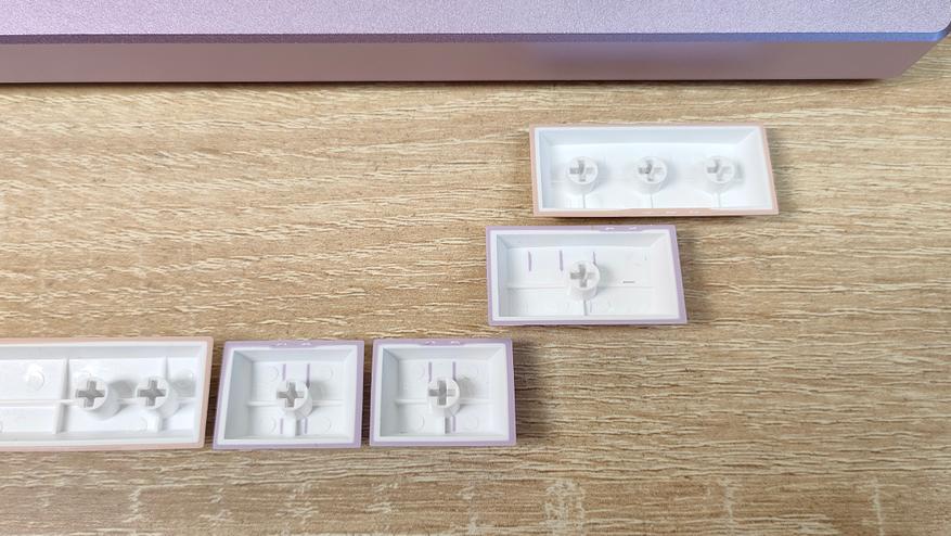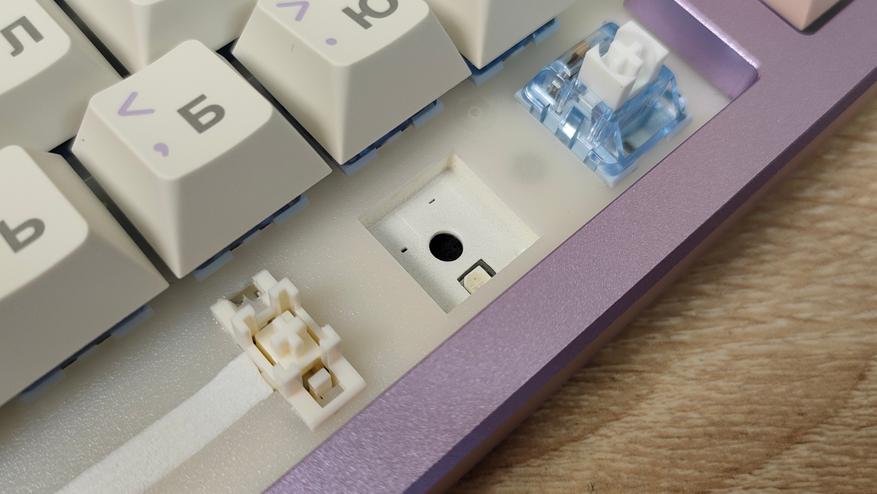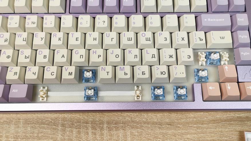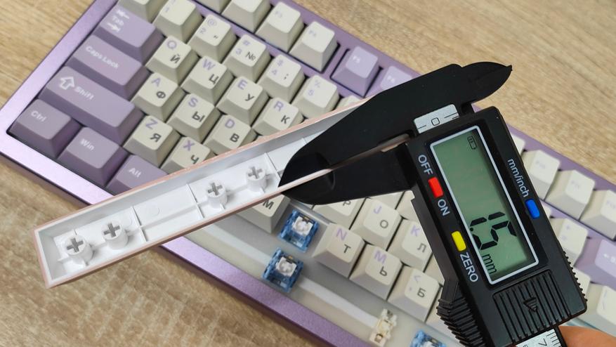 Колпачки изготовлены из PBT пластика методом двойного литья. Толщина стенки равна 1.5 мм (где-то встречается 1.6, где-то встречается 1.7), что вполне стандартно, но немало, массмаркет часто балуется меньшим значением, например, 1,2 мм. Свет колпачки не пропускают, так что, стоит позаботиться об освещении на рабочем месте. Стабилизаторы установлены в пластину позиционирования и обильно смазаны, что видно невооруженным глазом, но капля не растекается по пластине, что уже хорошо. Клавиатура собрана на прокладках, и хорошо, и мягко прогибается при нажатии, а значит, будет гасить лишнюю вибрацию при печати и соответственно постукивании.