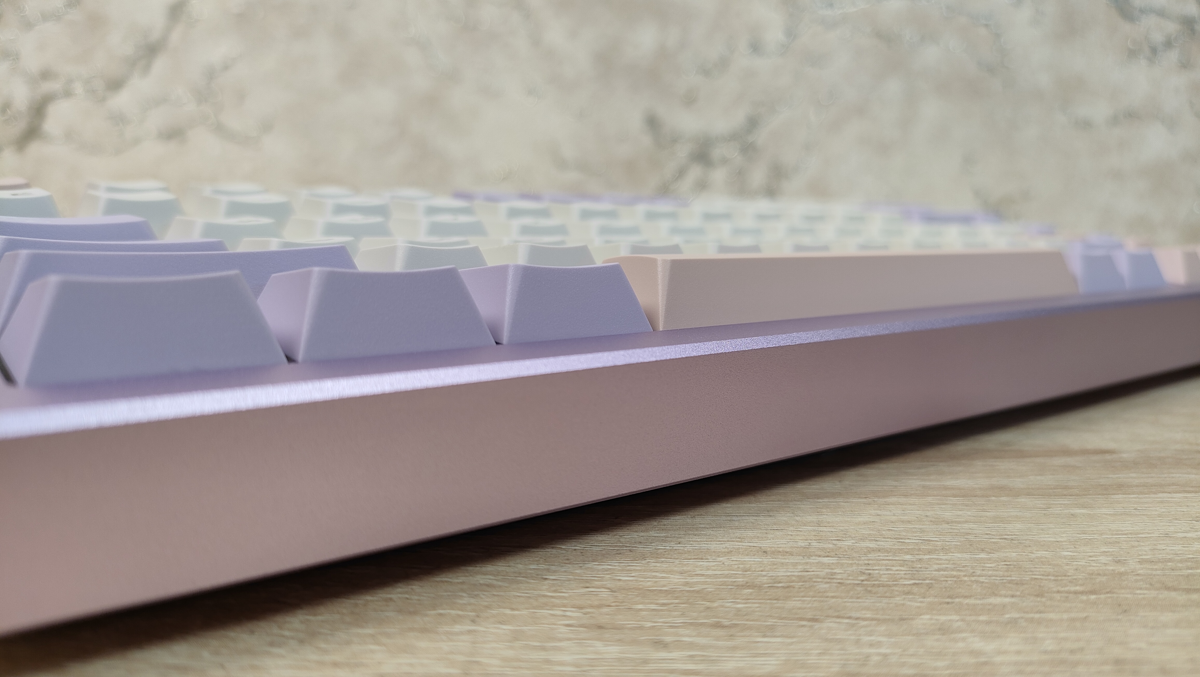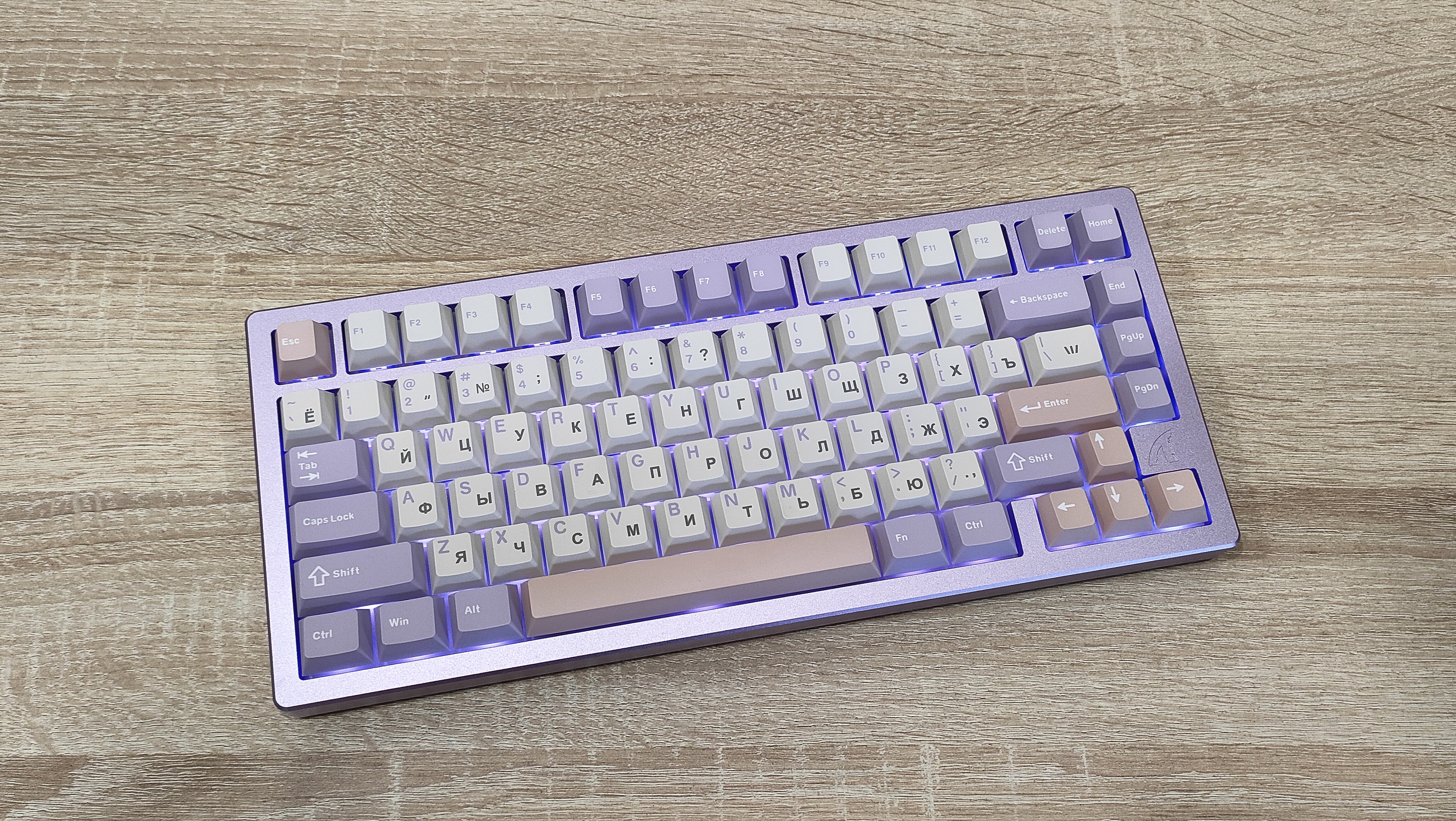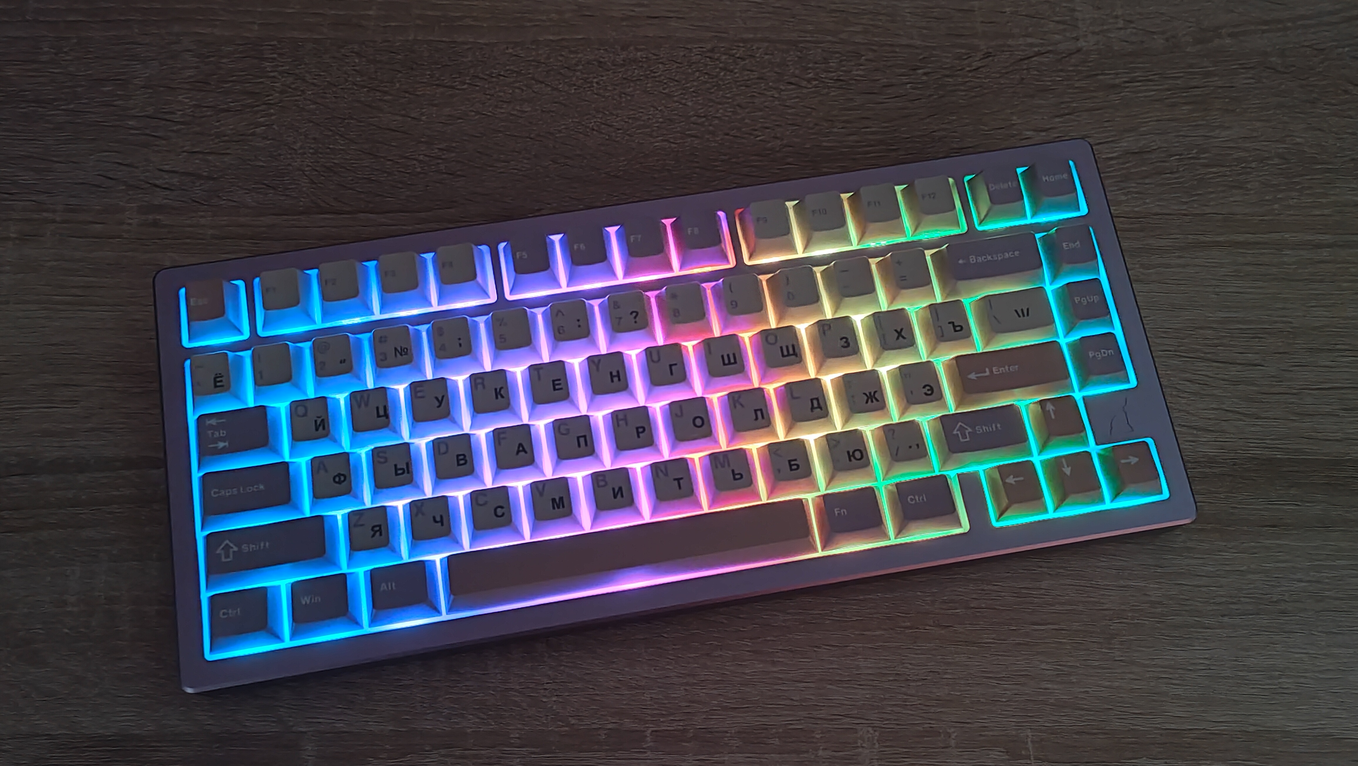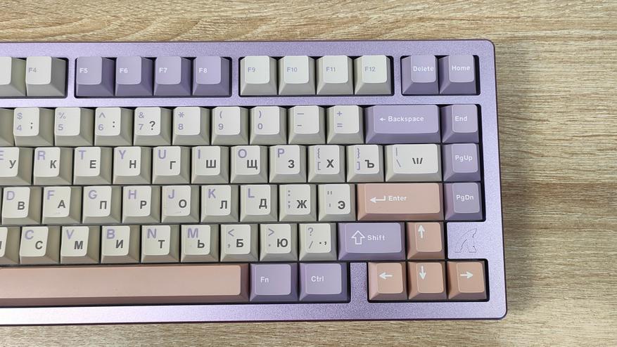 Формат клавиатуры ~75%, ANSI, широкие шифты и одноэтажный Enter. Клавиша F1 находится почти над «1». Профиль колпачков — стандартный и привычный Cherry. Привыкать не придется, т.к. это, наверное, самый распространенный вариант, даже без учета того, что он похож на OEM. А вместе они вообще занимают 80% рынка, опять же, наверное.