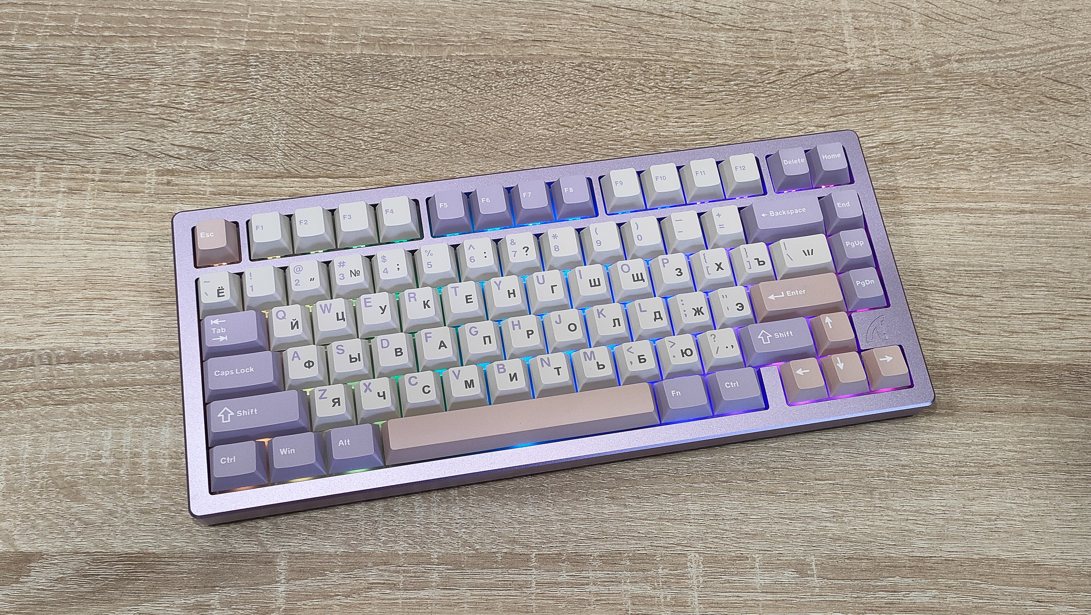 Attack Shark X75 — лавандовый РАФ в мире клавиатур, на мой взгляд, выглядит отлично, есть что-то в этих спокойных цветах притягательное. Возможно, это из-за того, что мне надоела чёрно-белая гамма, которая преобладает в мире клавиатур и мышек. Кислотные расцветки тоже не всем нравятся, а вот такие спокойные можно вписать в большое количество рабочих мест, да и в целом, не напрягают глаз. Если отойти от внешнего вида, то это тяжёлая клавиатура в алюминиевом корпусе, с мощной программной поддержкой, и более-менее стабильной работой переключателей. Переключатели линейные и простые, поэтому могут через какое-то время потребовать внимание, в виде перемазывания или можно сделать это сразу и дополнительно смазать их, главное, не перестараться, чтобы работа не вязла в смазке.