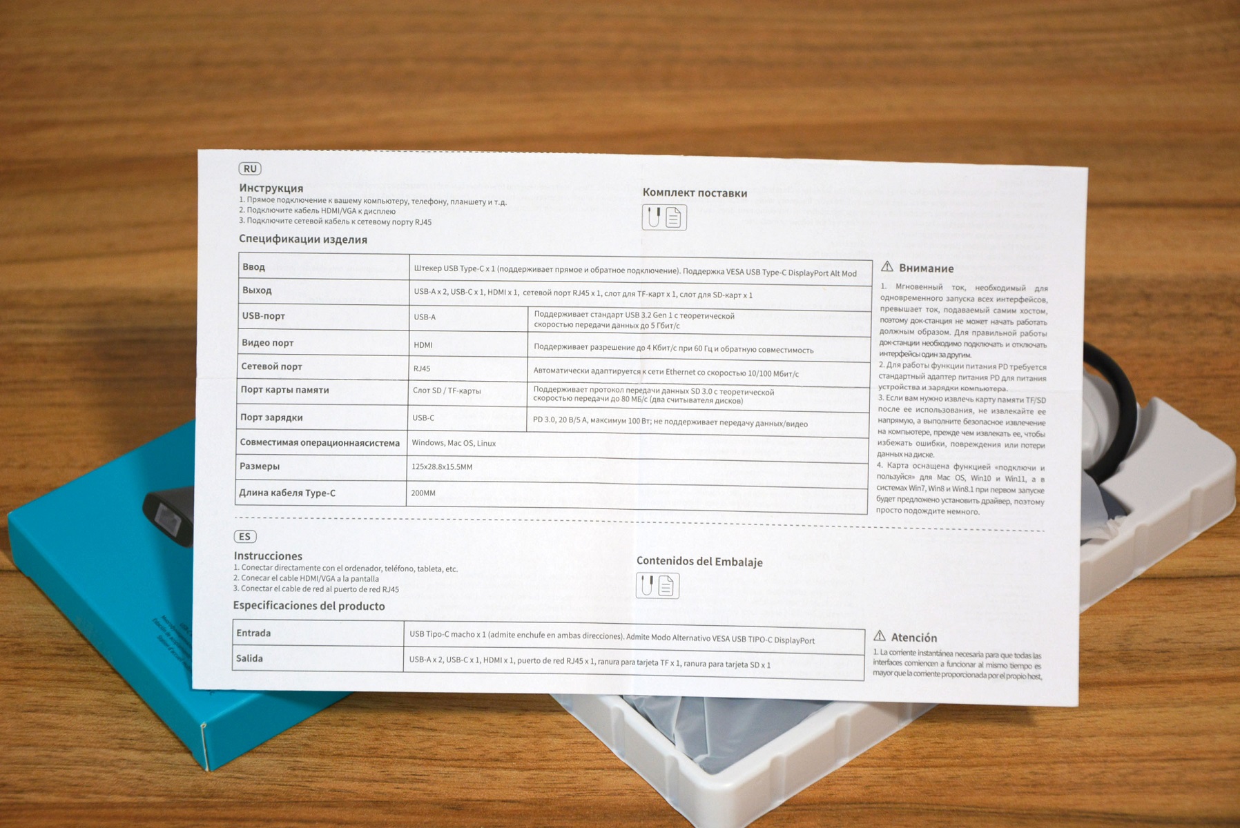 Покупатель получает станцию в плоской коробке, иллюстрированной в фирменном стиле Rapoo — с изображением устройства на бирюзовом фоне. На обратной стороне указаны характеристики, а сама станция укладывается в пластиковый лоток.