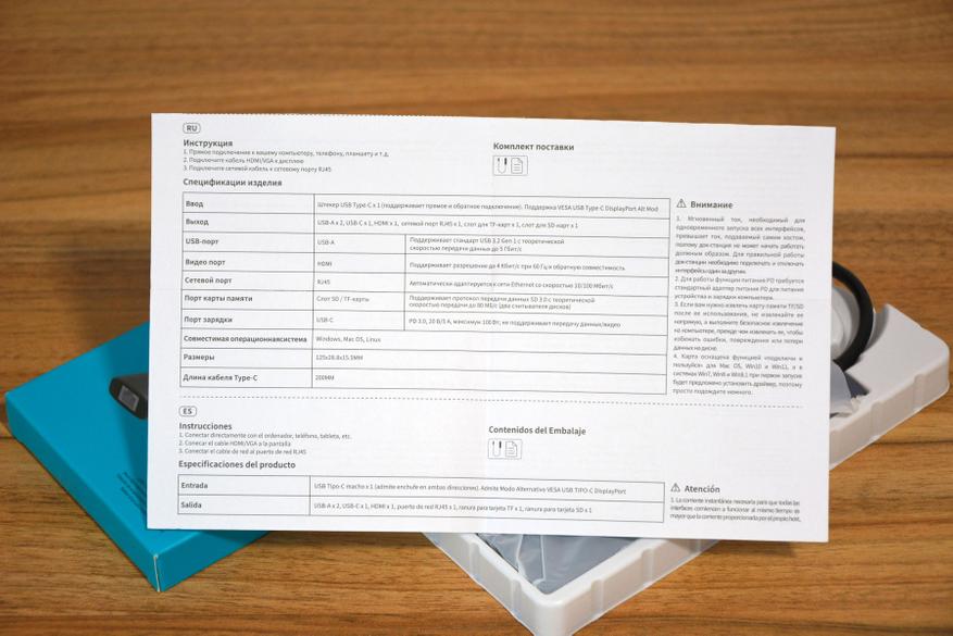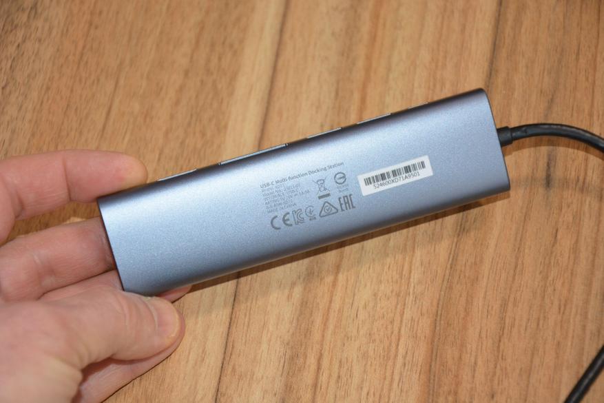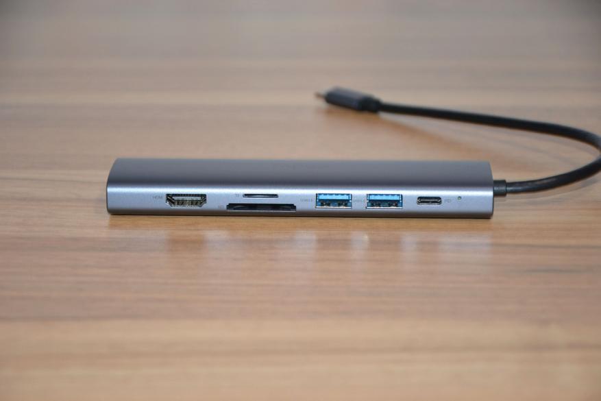 На передней, лицевой грани корпуса разместились: порты HDMI, через который можно выводить картинку с ноутбука на обычный монитор или ТВ в качестве 4К с частотой 60 Гц, слоты картридер для карт памяти формата SD и TF, которые, не мешая друг другу, работают параллельно, два порта USB-A версии 3.0 и порт USB-S для питания или зарядки ноутбука по протоколу PD с мощностью 100 Вт, что очень востребовано в современных ноутбуках. Порт не поддерживает передачу данных, его задача узкоспециализированная — обеспечить требуемую мощность и скорость зарядки аккумулятора ноутбука. О работе устройства информирует деликатное свечение светодиода рядом с портом Type-C.