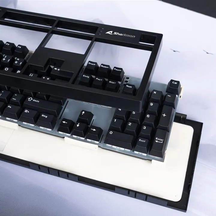 Внутренняя архитектура клавиатуры включает крепление с прокладочной системой, монтажную пластину из поликарбоната и звукопоглощающие вставки из полиуретана. Данное сочетание материалов направлено на снижение шума и вибраций при наборе текста.