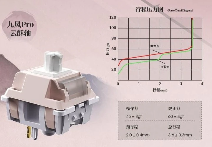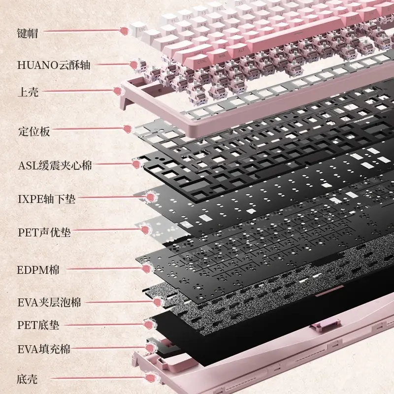 Производитель установил в клавиатуру механические переключатели собственной разработки Huanuo под названием Cloud Crisp. При этом конструкция поддерживает технологию горячей замены, что позволяет пользователям самостоятельно менять переключатели без пайки. Клавиши покрыты колпачками из PBT-пластика, изготовленными методом двухкомпонентного литья с нанесением символов сбоку.