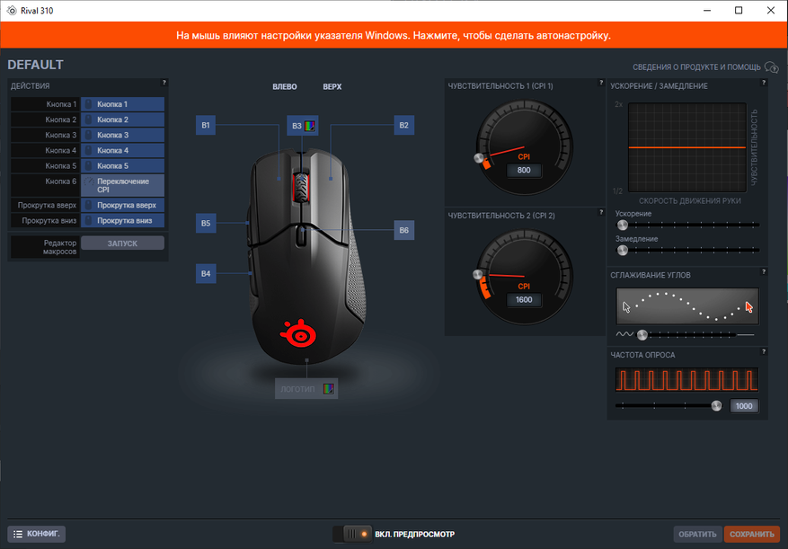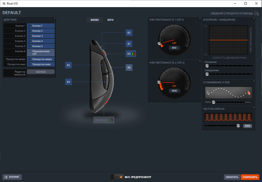 Основное меню тут одно, в нем собрано все доступные параметры, которые можно изменить. Имеется возможность регулировать чувствительность мыши (в пределах 50 – 12 000 cpi), при чем можно выбрать задать уровень cpi индивидуально для двух режимов. Кроме регулировки чувствительности мыши, ПО позволяет отрегулировать уровень чувствительности (ускорение и замедление), сглаживание углом, частоту опроса, переназначить кнопки и записать макросы.