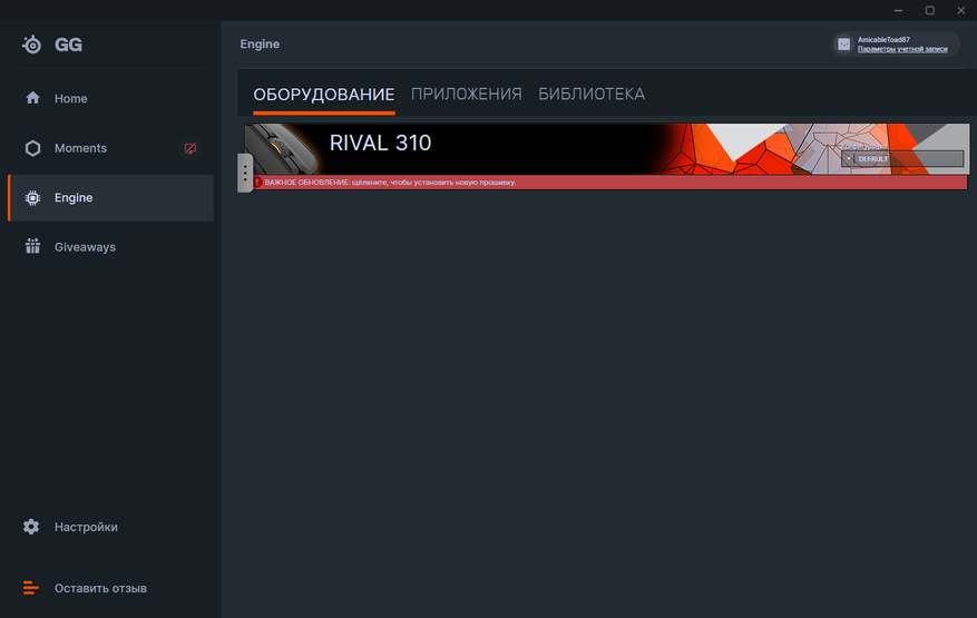 Steelseries Rival 310 работает с ПК в связи с программой Steelseries GG (на момент написания поста, версия приложения - 19.2.0). Интерфейс программы излишне перегружен информацией. Чтобы перейти к настройке мыши, необходимо перейти в Engine -> Оборудование, где находится панель с самой мышкой.