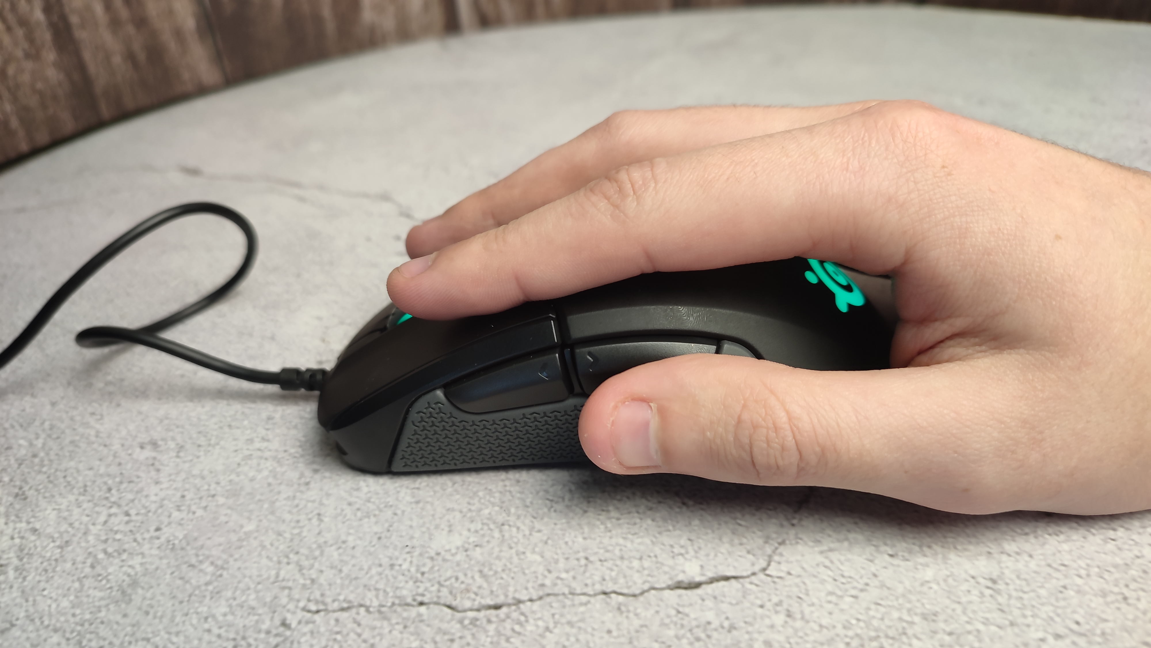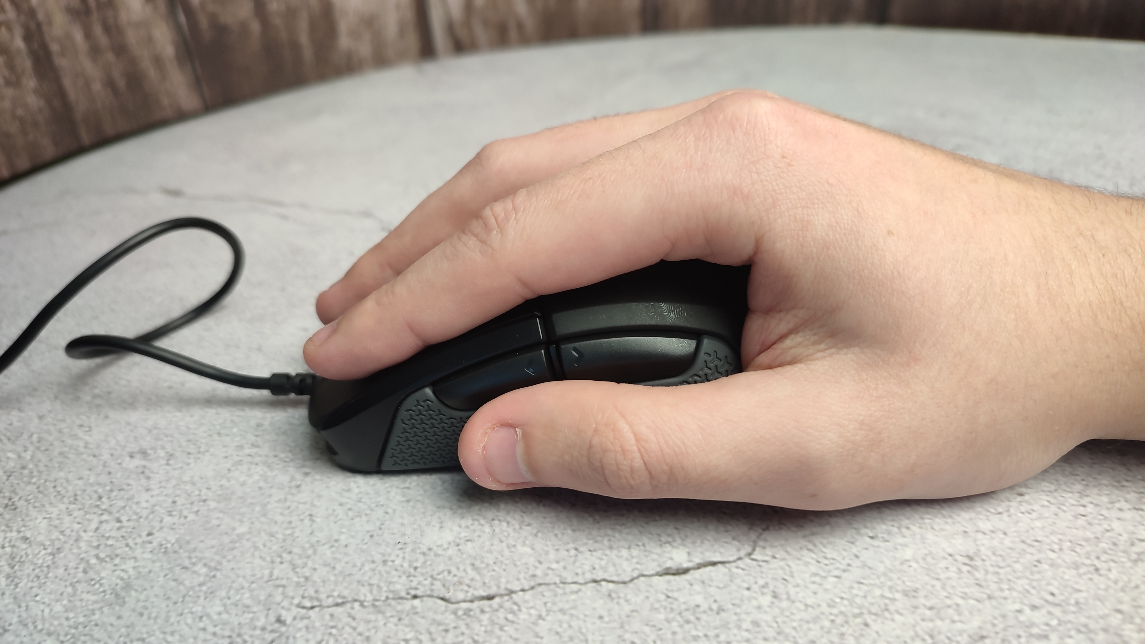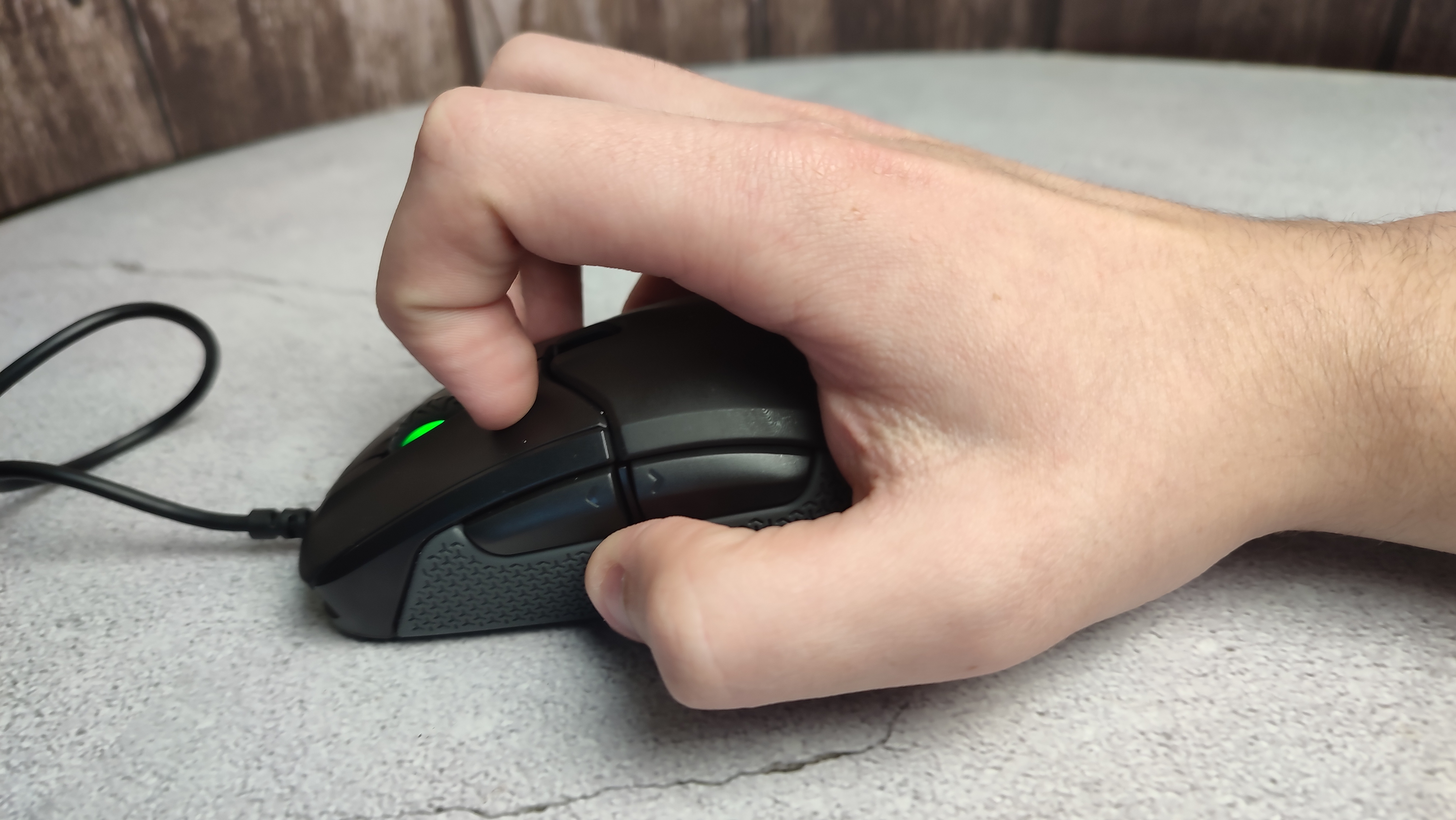 Мышь из-за своей формы подойдет не под каждую ладонь, я к ней смог привыкнуть примерно спустя дня 3 пользования, до этого она вызывала дискомфорт. Ниже приведены примеры с ладонным, пальцевым и когтевым хватами. Как видно, к доступу к первой боковой кнопке может возникать проблемы при пальцевом хвате.