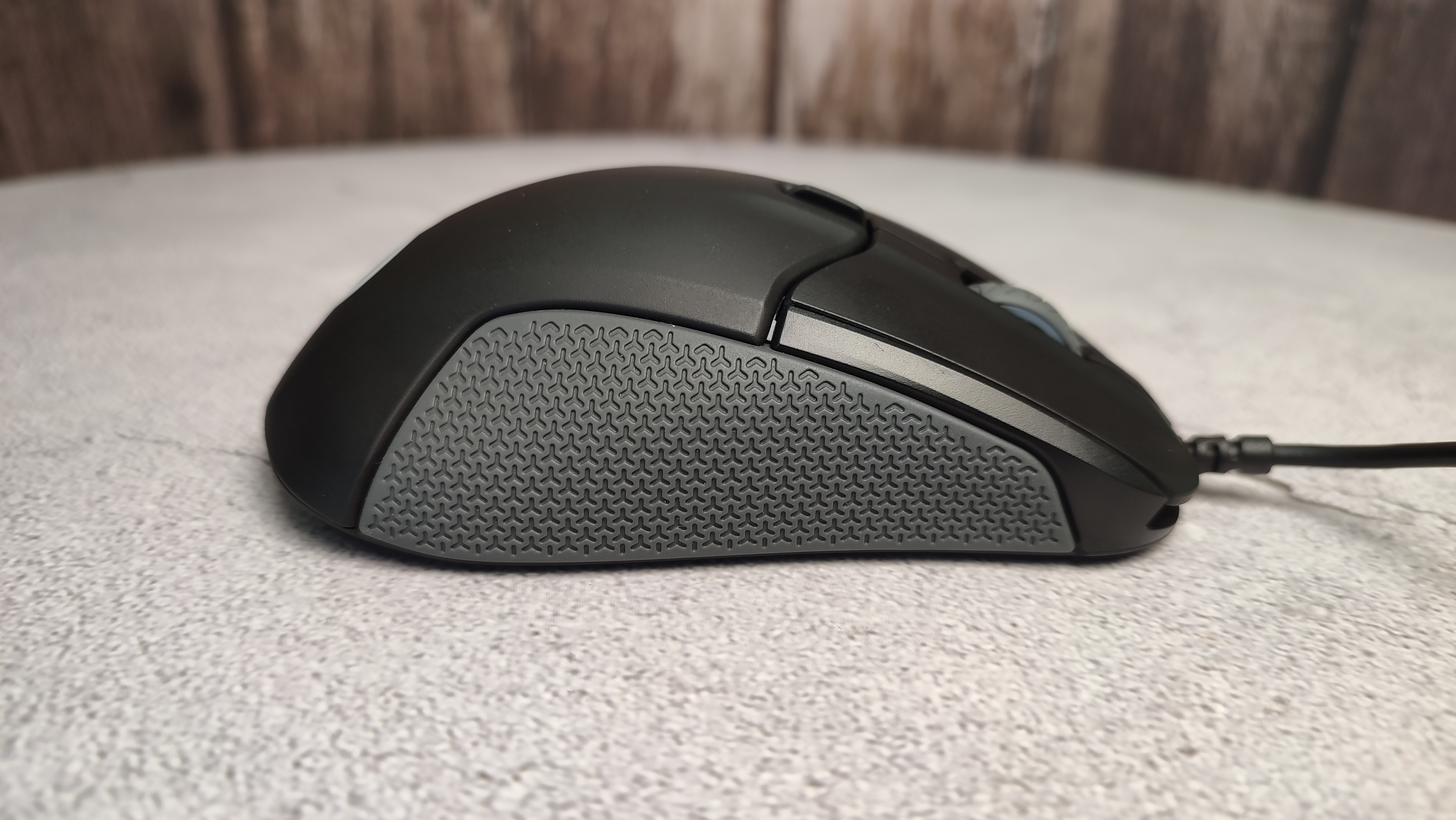 Можно похвалить мышь за огромные боковые силиконовые вставки с рисунком. На левой стороне размещены внушительного размера кнопки. Нажатие их достаточно тугие, с отчетливым кликом, свайпами нажимать их не совсем удобно. Имеются стрелочки для быстрого распознания кнопок.