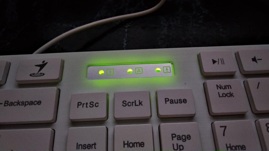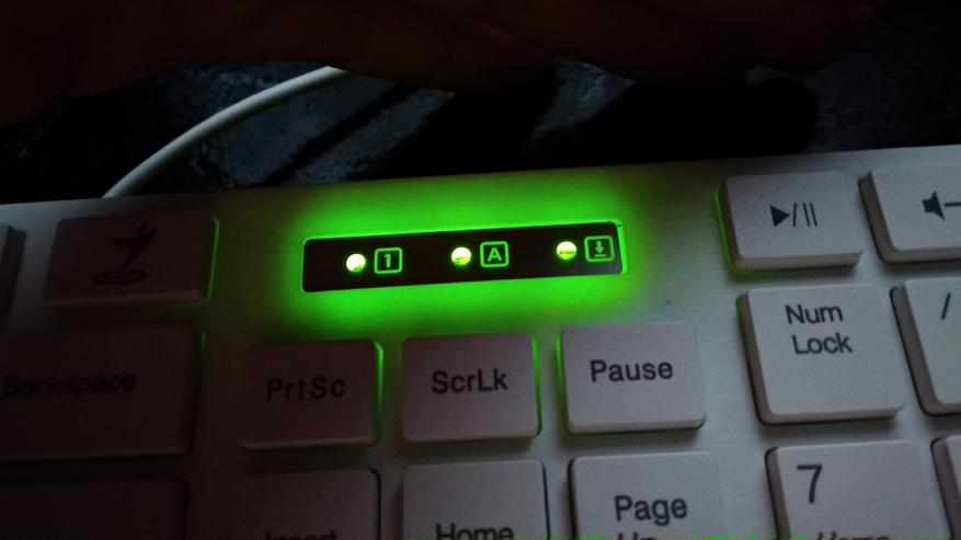 Индикаторы расположены над блоком редактирования/управления курсором. Они обозначены условными знаками, которые всем до боли известны. При активации излучают зеленый свет, который немного передается на корпус клавиатуры, таким образом получается ореол свечения, который заметен в темноте.