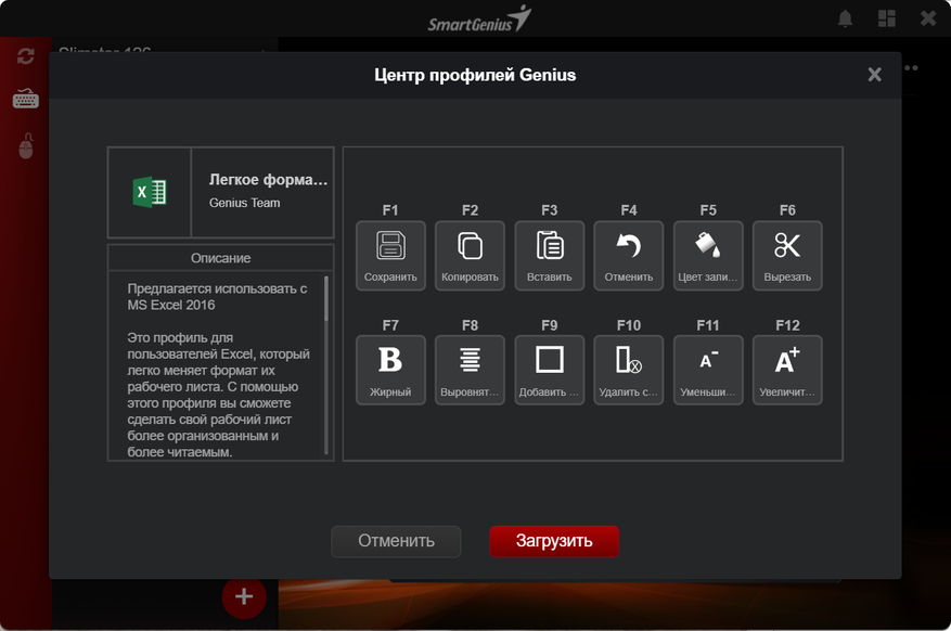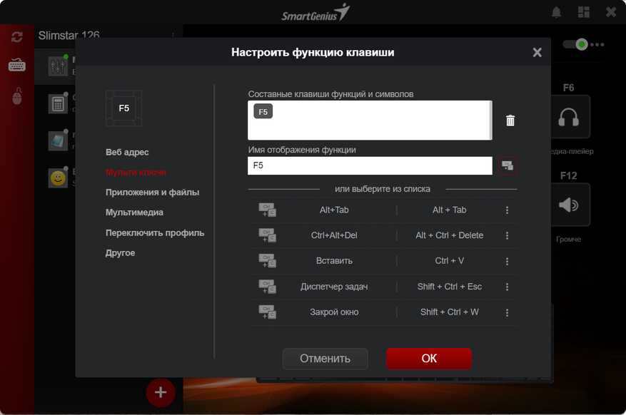 Когда запущена программа SmartGenius, у нас не работают функциональные клавиши, работает только назначенный профиль. Если нужно быстро настроить профиль или мы забыли действие на клавише, можем нажать ту самую дополнительную кнопку около F12, именно она запускает панель. Без запущенной программы, она запускает/открывает пустую вкладку в браузере.