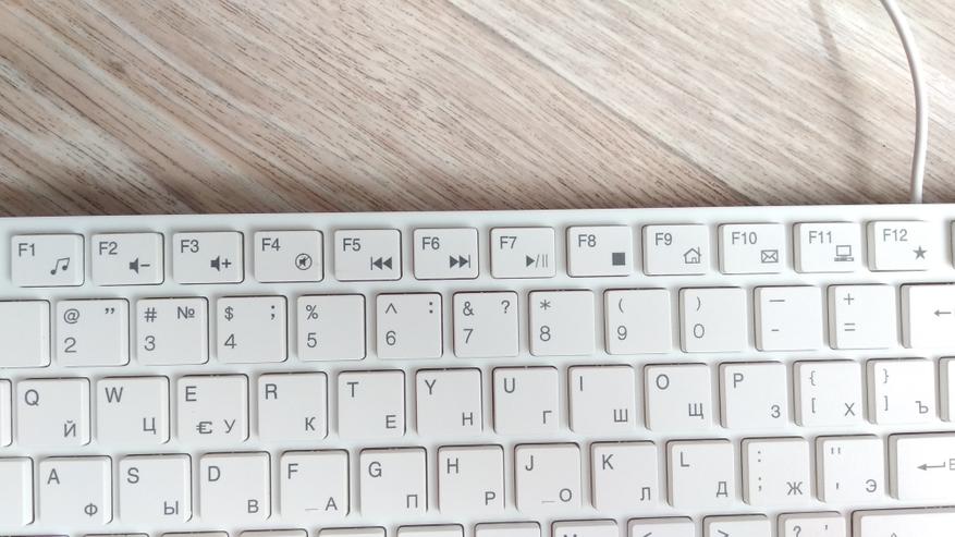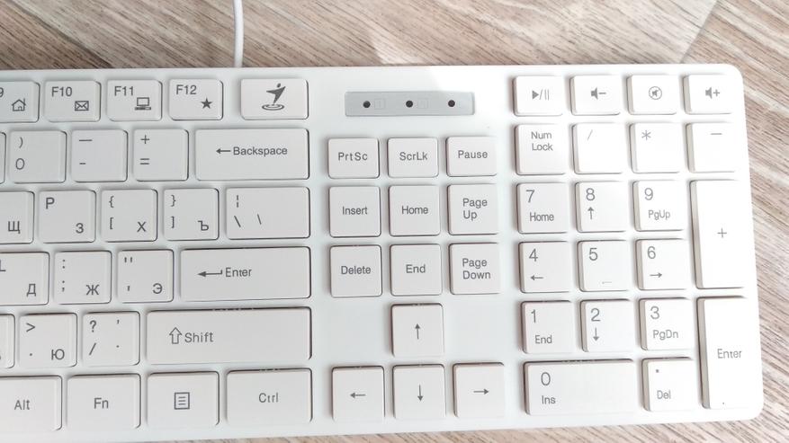 Клавиша Enter половинной высоты, в том плане, что по высоте занимает 1 клавишу. Стрелки и Backspace полноразмерные. Выступы на клавишах F/А и J/О на месте, а значит слепая печать очень даже возможна.
