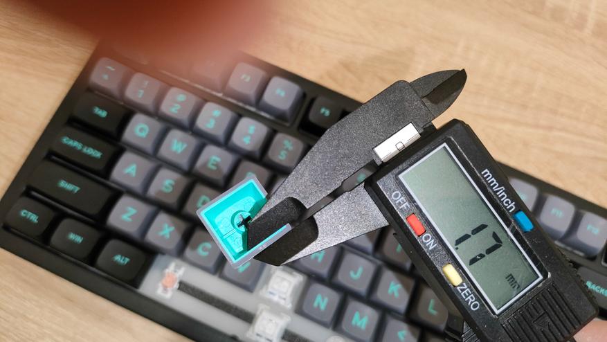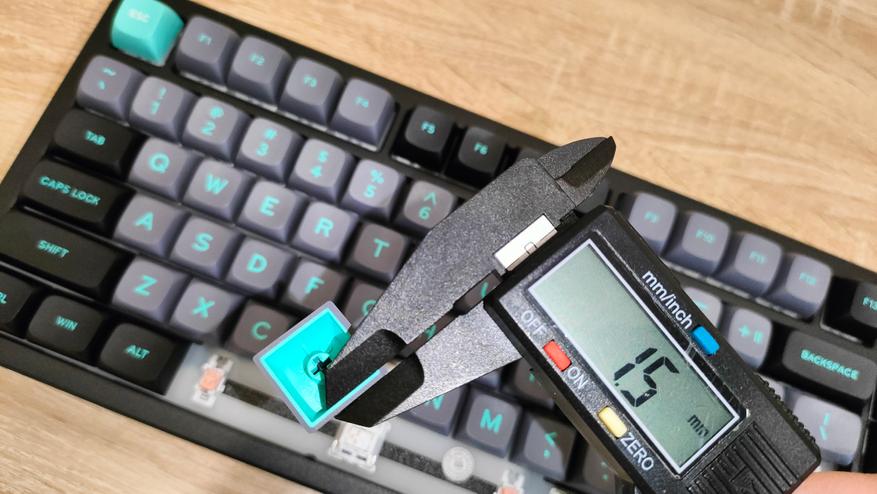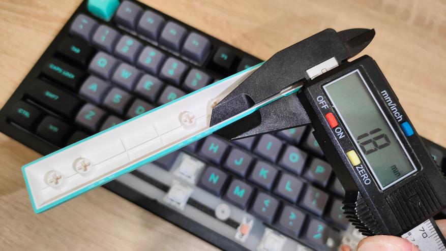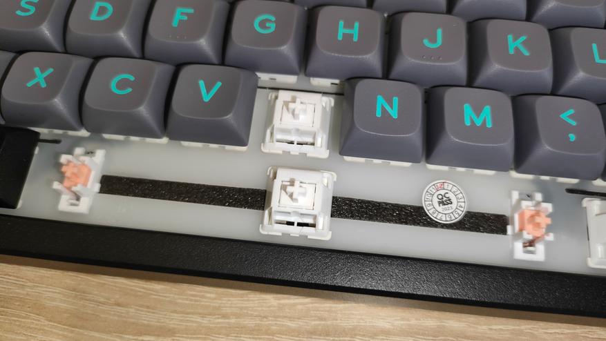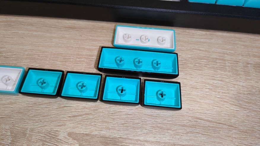 Колпачки изготовлены двойным литьем пластика PBT, соответственно непрозрачные. Не знаю, баг или фича, но стенки у колпачков разные, можно увидеть 1,8 мм, и 1,5 мм. Толстая стенка одна и та же у всех, поэтому скорее фича. В любом случае, толщина хорошая. Стабилизаторы установлены в пластину позиционирования и очень обильно смазаны, каплю видно невооруженным глазом. На той же пластине видны прорези, которые помогают сильнее прогибаться при нажатиях, в итоге «играет» она очень неплохо, что однозначно положительно скажется на общем впечатлении при печати.