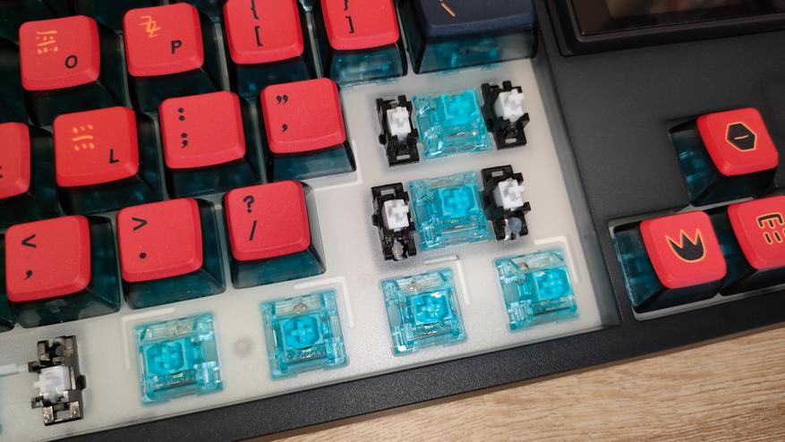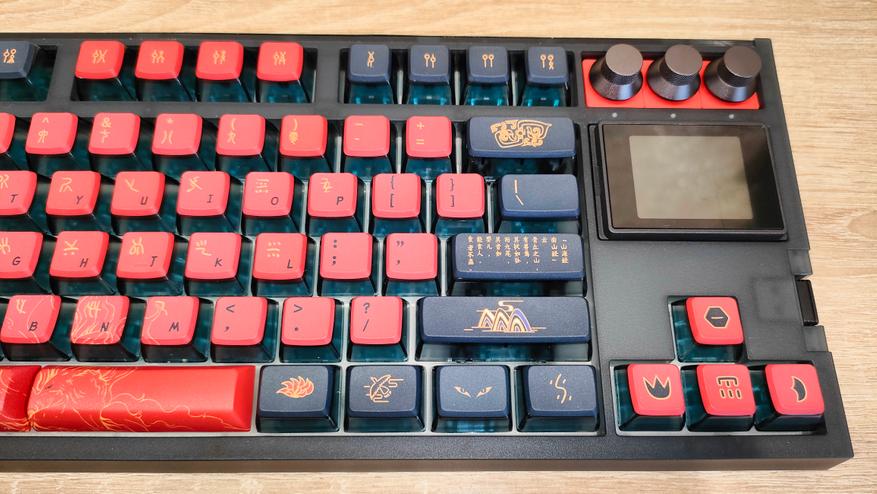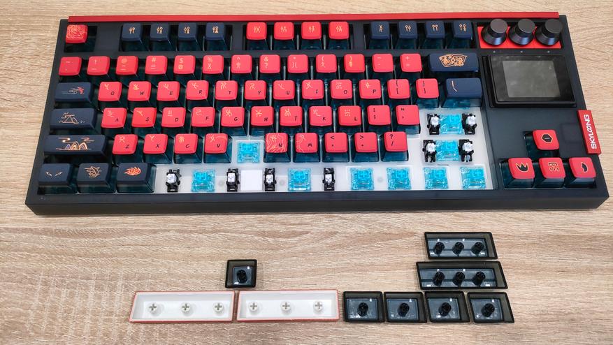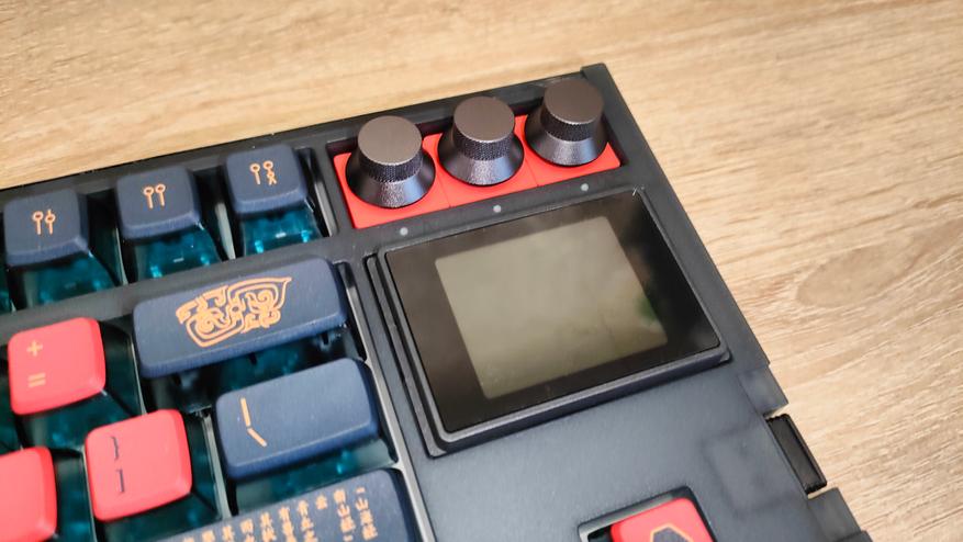 Подсветка, естественно слепая, т.к. колпачки с непрозрачной легендой. Экран имеет несколько тем, я выбрал красную в тон клавиатуре.