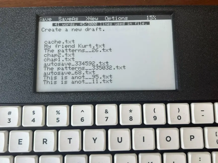 Программное обеспечение написано на платформе, совместимой с Arduino, и распространяется с открытым исходным кодом. Поддерживаются два режима: черновик (непрерывный набор) и редактирование (перемещение курсора с помощью стрелок). Все файлы сохраняются в формате .txt на карте microSD объёмом до 128 ГБ. Для переноса готовых текстов на компьютер используется подключение через USB или сканирование QR-кода, который отображается на экране устройства.