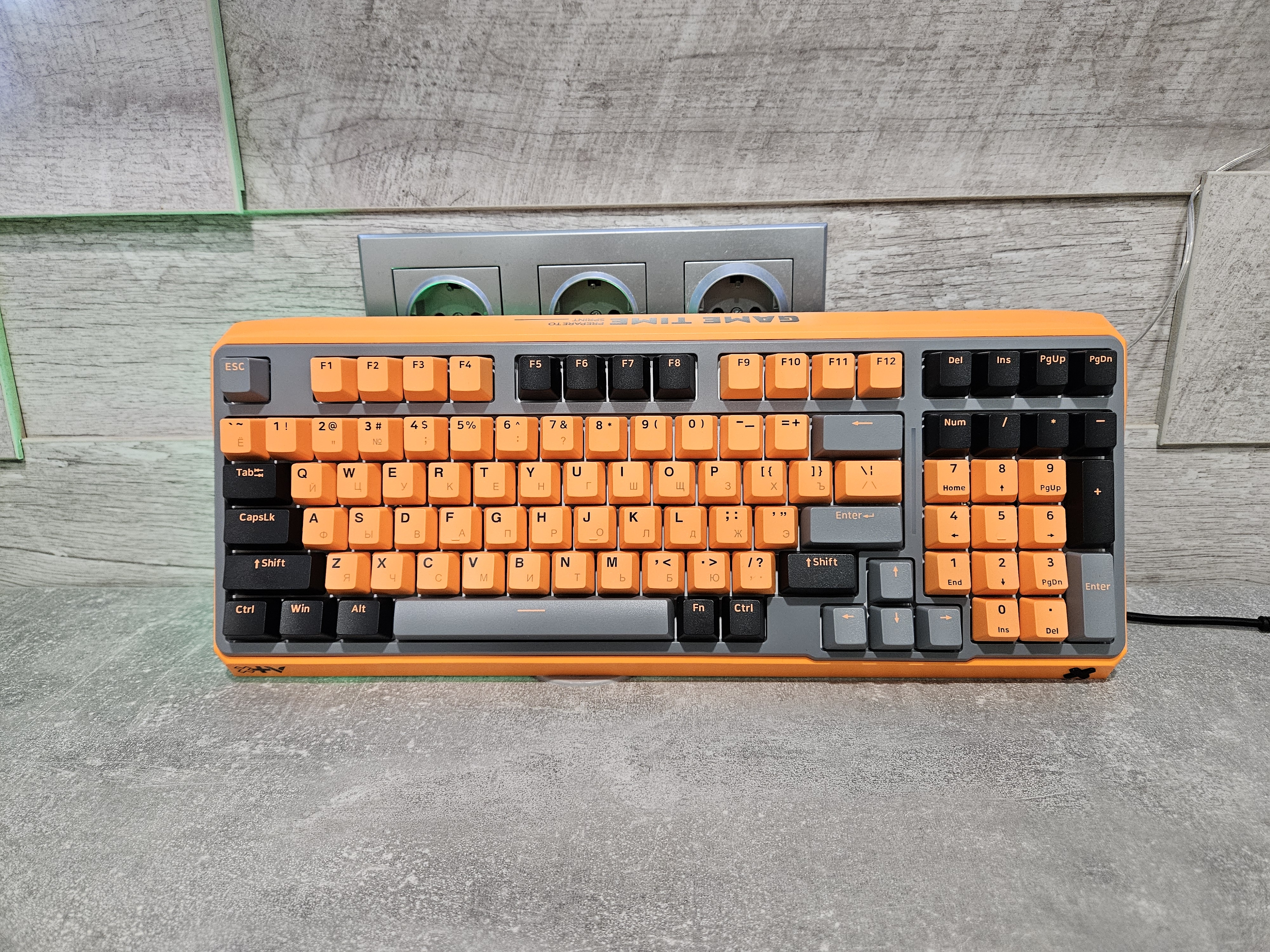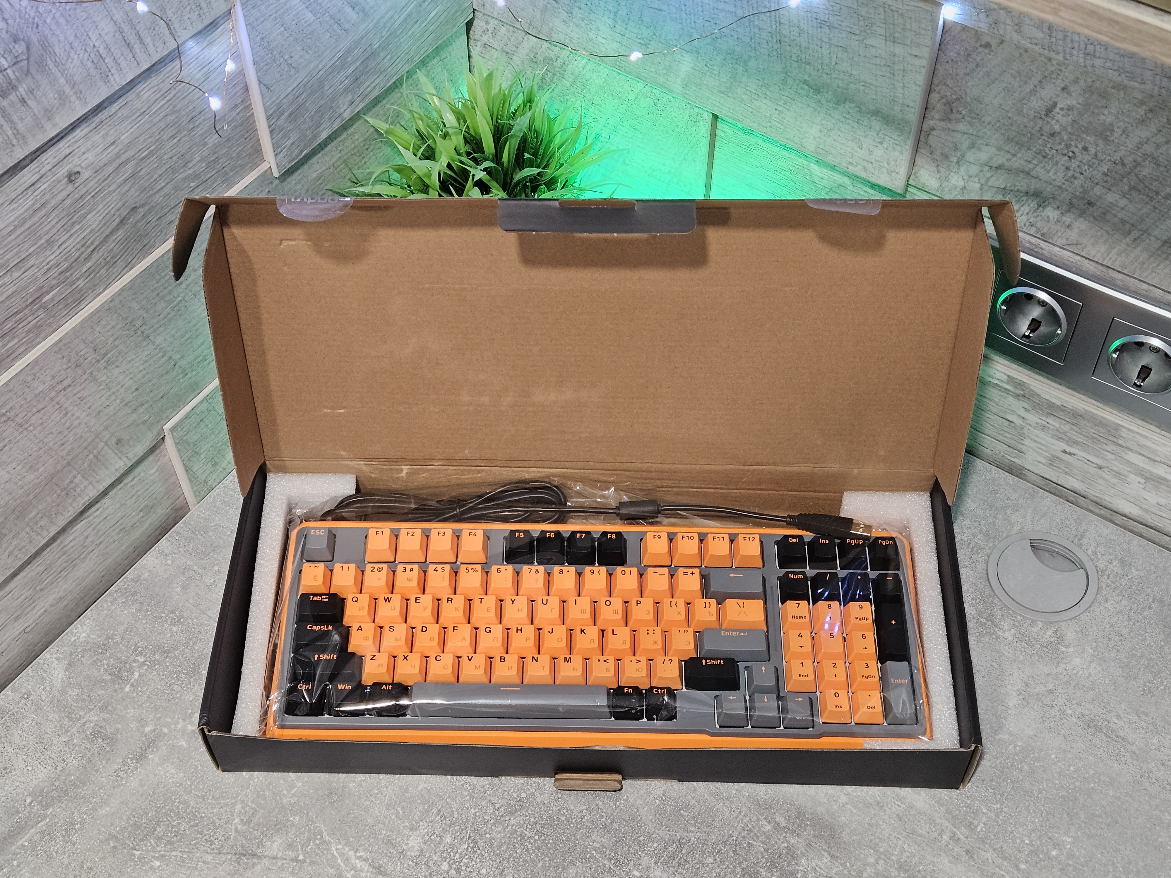 Модель выделяется ярким дизайном. Основной акцент создается за счет сочного оранжевого цвета, в который окрашены внешняя рамка и большинство клавиш в основной зоне. Этот яркий элемент уравновешивается черными акцентами на некоторых клавишах и спокойным серым цветом корпуса и оставшихся кнопок. Такой контрастный подход превращает устройство из обычного гаджета в стильный элемент рабочего пространства.