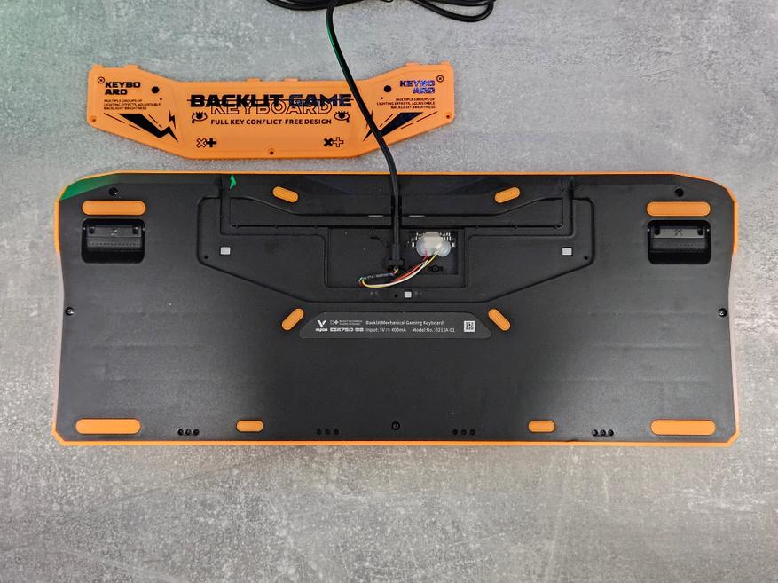 Система прокладки кабеля — интересное решение, которое лично я не встречал в других клавиатурах. Сняв заглушку, вы сможете вывести USB-кабель из одного из трёх каналов: слева, справа или по центру. Это помогает организовать пространство на столе и избавиться от путаницы проводов. Клавиши расположены со смещением, что позволило сохранить все функции, сделав габариты меньше.