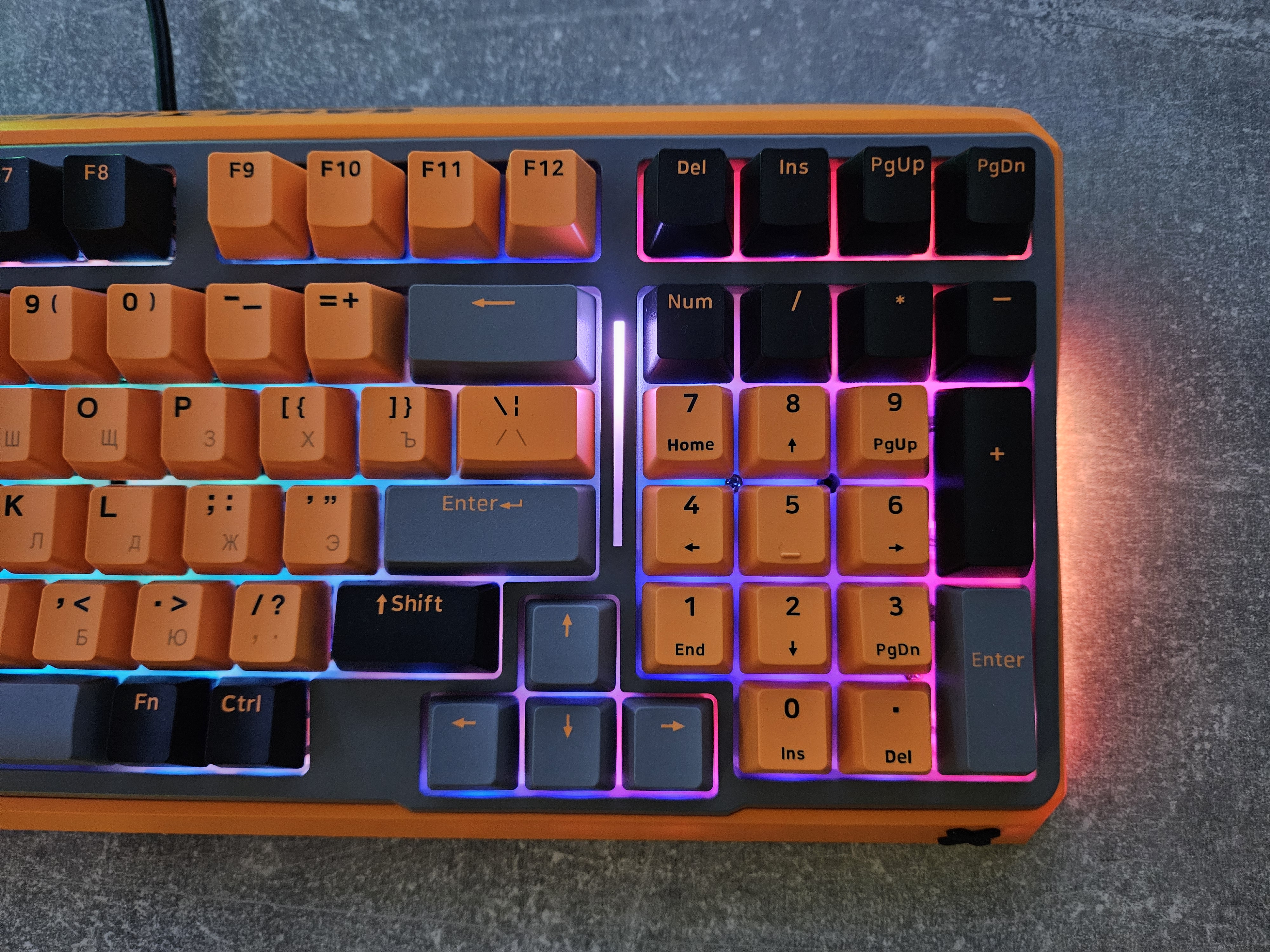 Несмотря на отсутствие подсветки символов, они хорошо читаются благодаря контрасту, а акцентная RGB-подсветка по контуру добавляет шарма и помогает ориентироваться в темноте. Есть очень много различных режимов, можно выбрать тот, который вам нравится больше всего, а также настроить яркость подсветки. Переключаются они комбинацией клавиш FN + PgUp \ FN + PgDn. Отдельно можно «рулить» подсветкой боковых led лент за счет нажатия FN + Ins.
