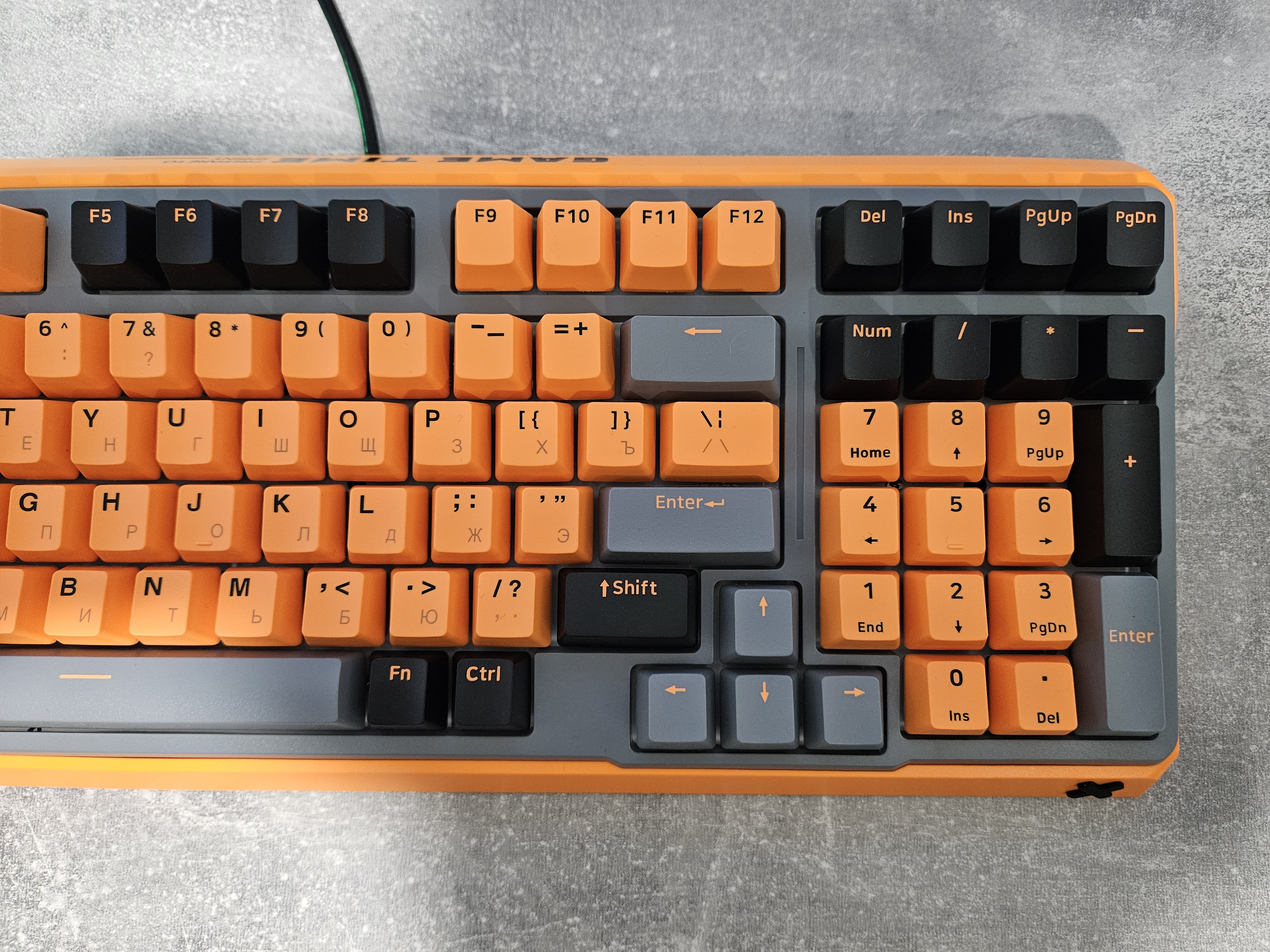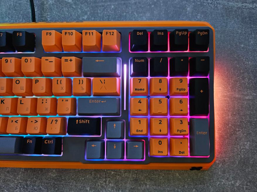 Клавиатура имеет 98-процентный формат, что обеспечивает идеальный баланс между компактными размерами и наличием полноценного цифрового блока, который немного смещен влево. Из-за этого стрелочные клавиши частично заходят в его зону, а правый SHIFT уже стандартного. Клавиша ENTER выполнена в однорядном исполнении.