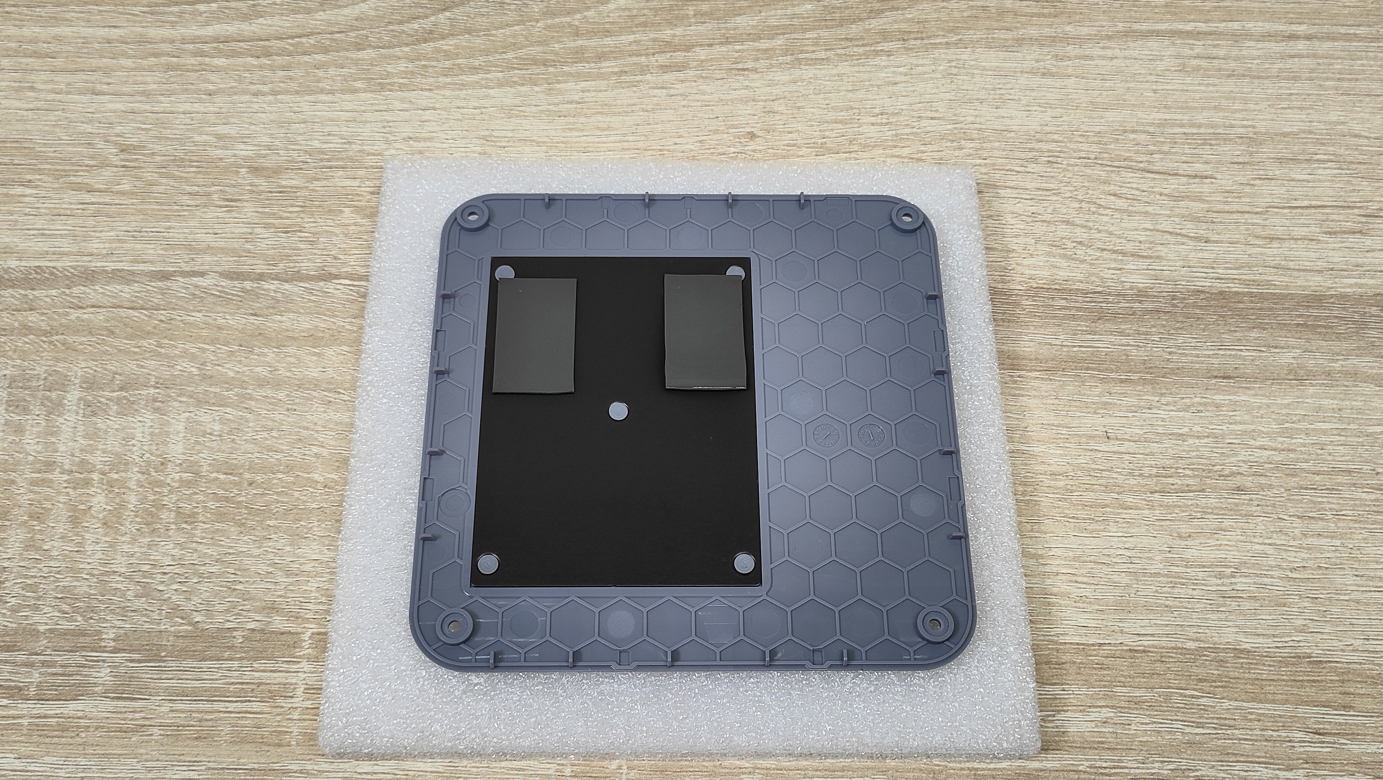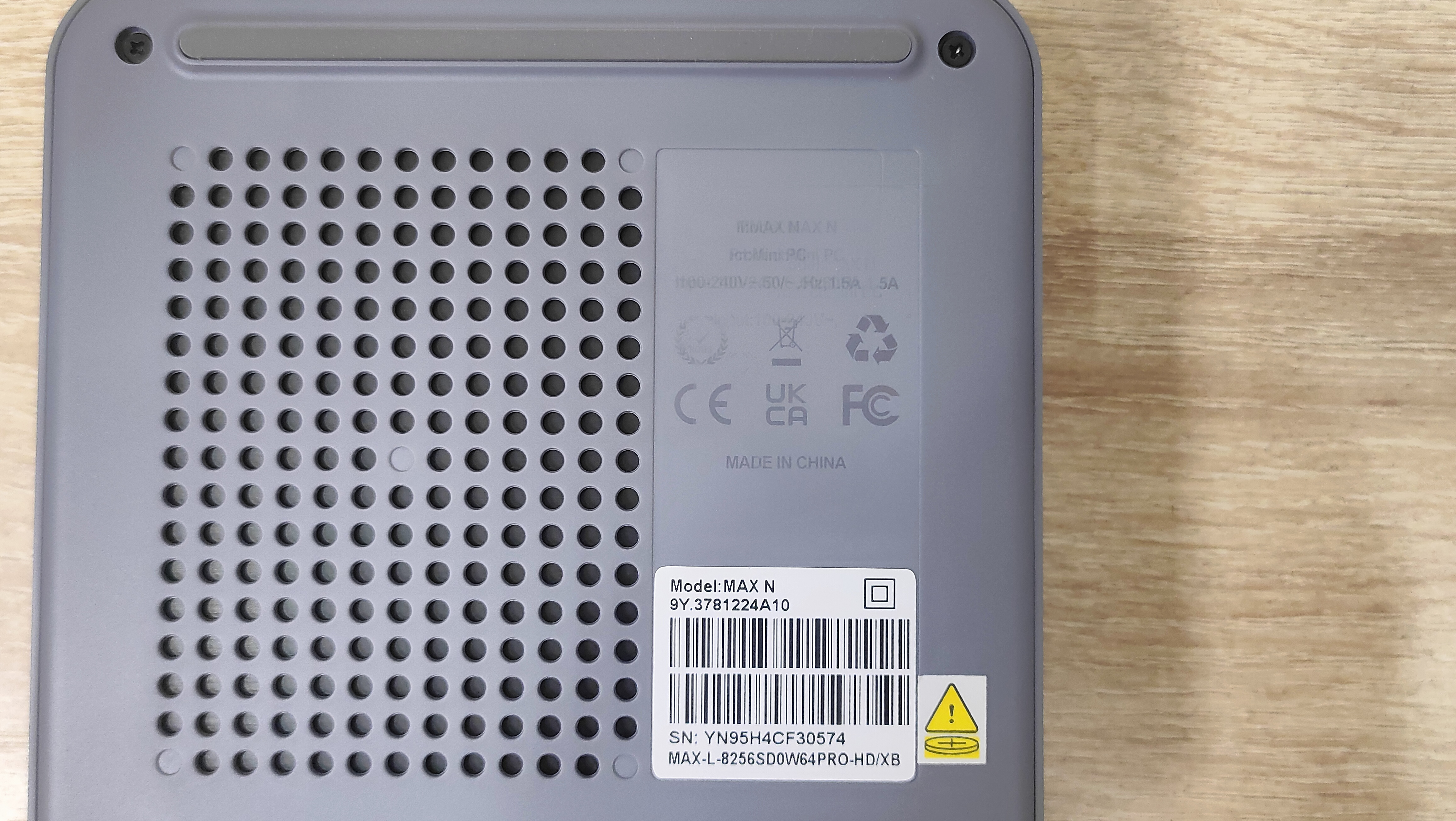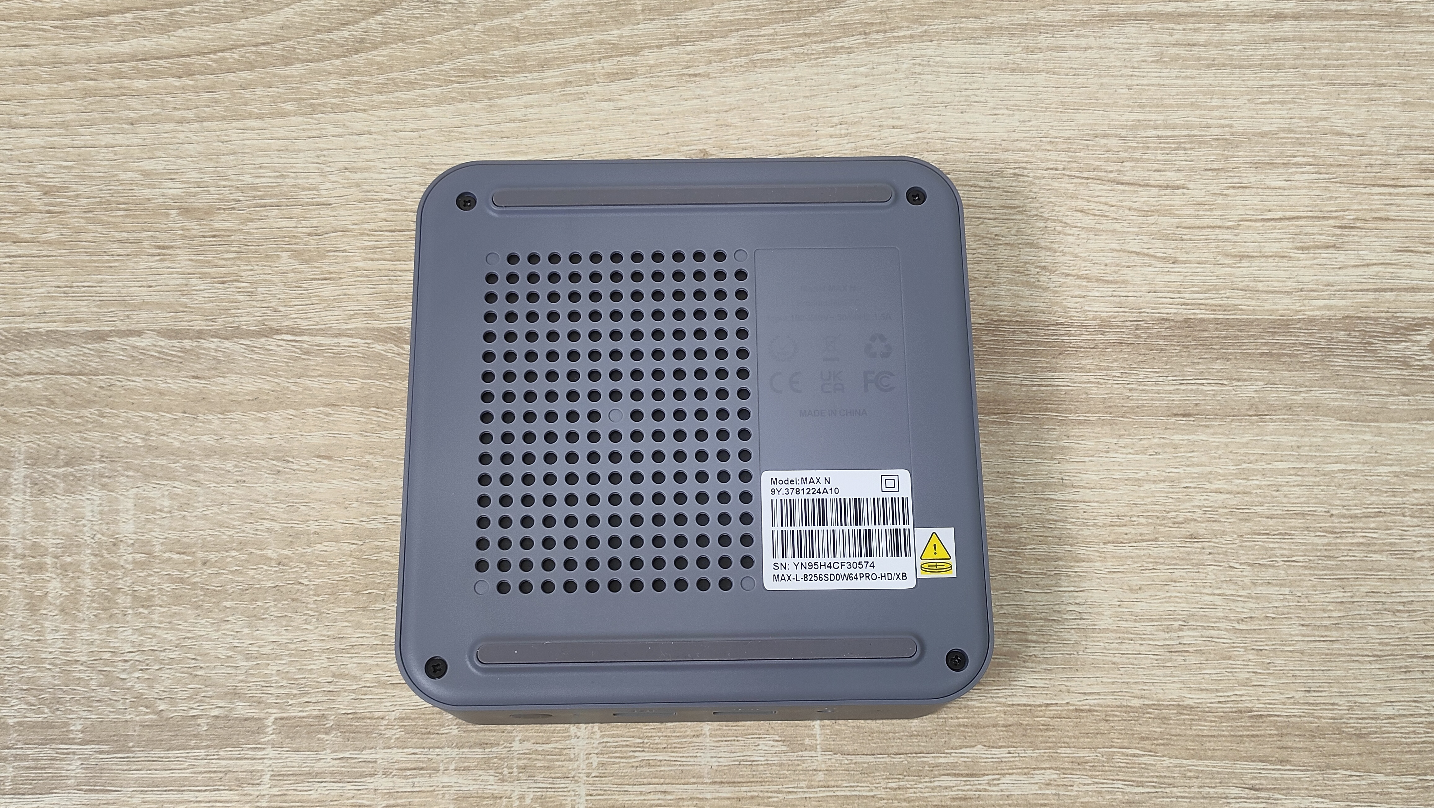 Верхняя крышка действительно перфорирована и за ней видна крыльчатка. С одной стороны хорошо, что есть простой доступ к воздуху для системы охлаждения, с другой стороны прекрасно понимаю, что спустя 5-10 дней здесь будет серое пятно из пыли, а если есть животные, то с добавлением шерсти. То есть протирать эту часть корпуса придётся часто, а ещё очень сильно рекомендую не ходить с напитками возле данного мини-ПК, и не переусердствовать с влажной уборкой, чтобы не образовалась капля, так как находящиеся вентилятор за этими отверстиями, непременно разнесёт ее в мелкодисперсный туман, который окажется внутри. На дне сразу привлекает к себе внимание огромный массив отверстий, который при более пристальном взгляде оказывается перекрыт чем-то внутри. Это фиаско. По углам классически расположены четыре винта, который крепят поддон, а ещё с двух сторон есть широкие силиконовые ложки, не считая привычной наклейки с базовой информацией.