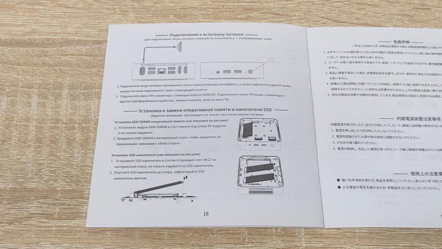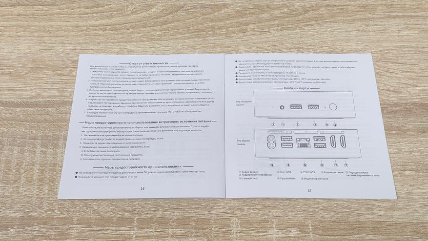 В остальном коробка как коробка, на лицевой стороне изображено устройство, на обороте таблица с характеристиками и наименование модели. Комплект поставки следующий: мини-ПК, кабель питания, метровый HDMI кабель, руководство пользователя.