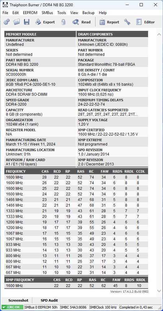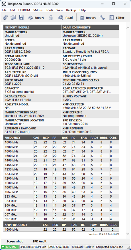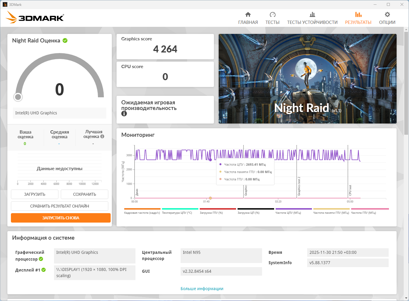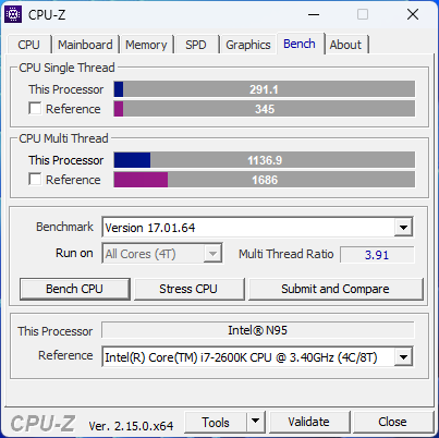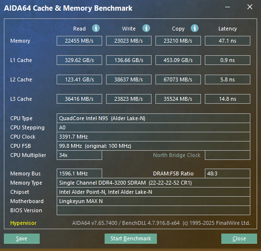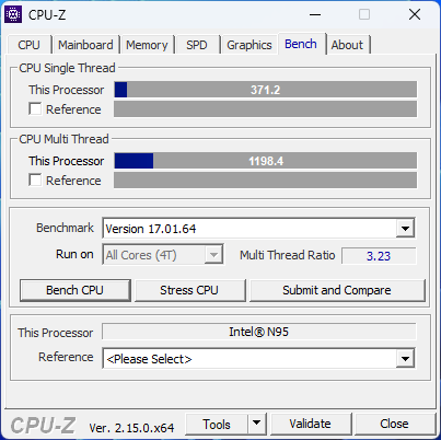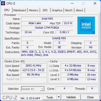 В данном мини-ПК установлен процессор Intel N95, это базовый и самый первый процессор в данной линейке, ему, кстати, в январе 2026 будет 3 года, многие его считают слишком «жрущим», и лучше взять какой-нибудь N100 или N150, однако, они сильно заблуждаются. В составе данного процессора 4 энергоэффективных ядра Alder Lake, значение теплопакета по паспорту равно 15 Вт, частота до 3.4 ГГц. Естественно, контроллер памяти одноканальный, а используемая память в данном компьютере — это DDR4, с частотой 3200 МГц, в данном случае базовый вариант 8 ГБ, именно такую версию я приобрёл исключительно для тестирования миника.