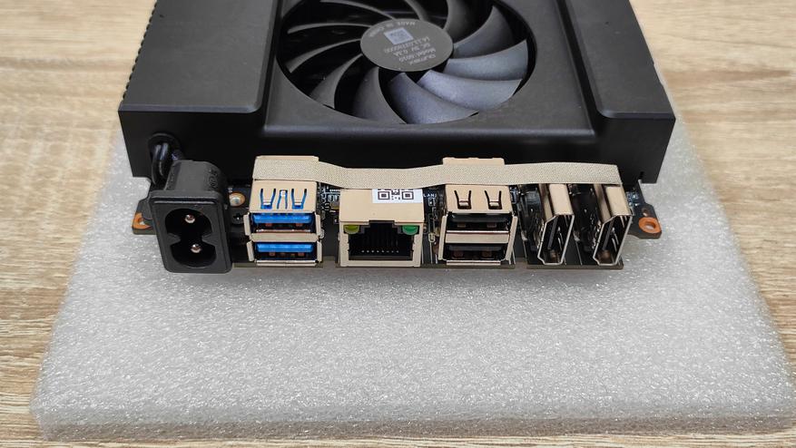 Разъемы на фронтальной панели: USB 3.2 gen2, USB 2.0, 3,5 мм комбоминиджек. На тыловой: 2*USB 3.2 gen2, 2*USB 2.0, 2*HDMI, проводная сеть, разъем питания C7 (двустволка). Общее количество разъёмов USB получается равно шести, что для мини-ПК в целом очень хорошо, так как USB много не бывает. Но в то же время, кого-то может огорчить отсутствие не только полнофункционального USB Type-c, но и такого разъёма вообще. Кроме того, лично я, предпочёл бы вместо второго HDMI установить DP, но это чисто моё предпочтение, как-то исторически сложилось, что один монитор у меня подключен по DP, другой по HDMI.
