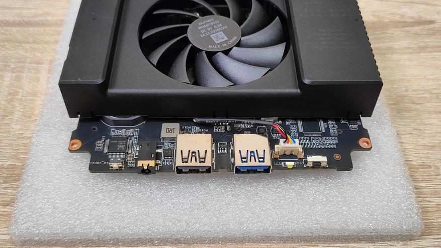 Фальш-отверстия, которые были видны на дне, прикрыты металлической пластиной, которая является радиатором для накопителей. В базе накопитель один, но термопрокладок сразу две, это однозначно плюс. Пластина, скорее всего, из алюминия и покрашена в чёрный, не магнитится, но это однозначно металл/сплав. После снятия крышки, по-классике доступно следующее: два разъёма М2, беспроводной модуль и память. Память маркирована AZW, это именно то, чего я и ожидал увидеть, и о чем я намекал, когда говорил про руководство. AZW — это завод, который изготавливает мини-ПК, насколько знаю под своей маркой Beelink, и вот OUMAX — это тоже его дочка или просто другой бренд, заказавший для себя у них компьютеры. Выкрутив винты можно вытащить плату и увидеть систему охлаждения, которая имеет определённый кожух для направления потоков воздуха на радиатор и пропускает его через блок питания. Поэтому, если кто-то переживает по поводу нагрева внутренностей из-за БП, то, скорее всего, здесь всё даже лучше, так как блок питания имеет активное охлаждение, а глядя на температуру процессора, можно понять, что система охлаждения справляется и с ним, и с тем, что блок питания тоже является генератором тепла.