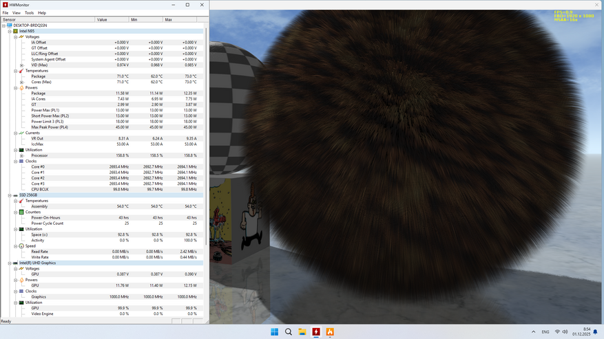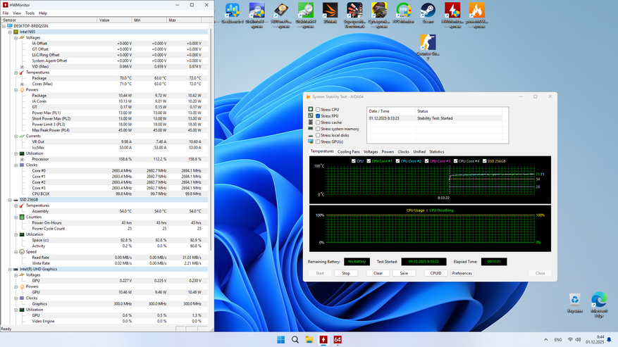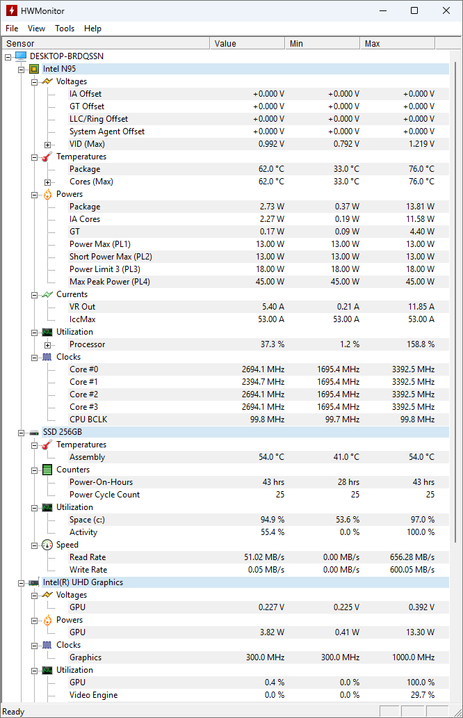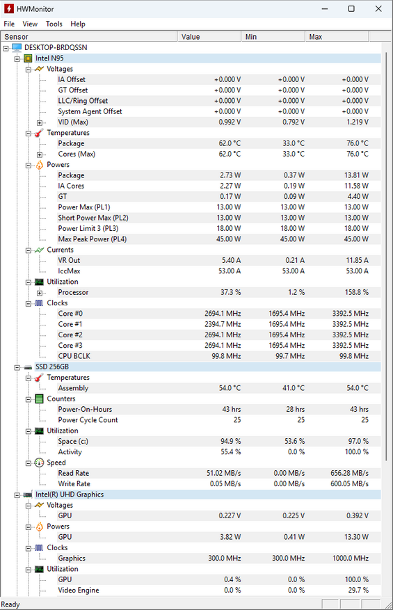 Первое, о чём хотелось бы рассказать, так это о том, что теплопакет в данном компьютере настроен приблизительно на 11-12 Вт, при паспортном 15. Сразу же брошу камень в огород тех, кто считает что N100, более экономичный, чем N95. N100 и N150 в последних мини-ПК настроенны приблизительно на 15 Вт, а тут наоборот, процессор чуть задушили, забегая вперёд скажу, что раздвинуть теплопакет мне не удалось в BIOS, либо мне не повезло, либо все фишки попросту не работают. При данном значении в синтетике процессор нагрелся приблизительно до 72°, что откровенно мало, импульсная реальная нагрузка разного характера смогла прогреть его до 80 градусов, что также немного. Но и это ещё не всё.