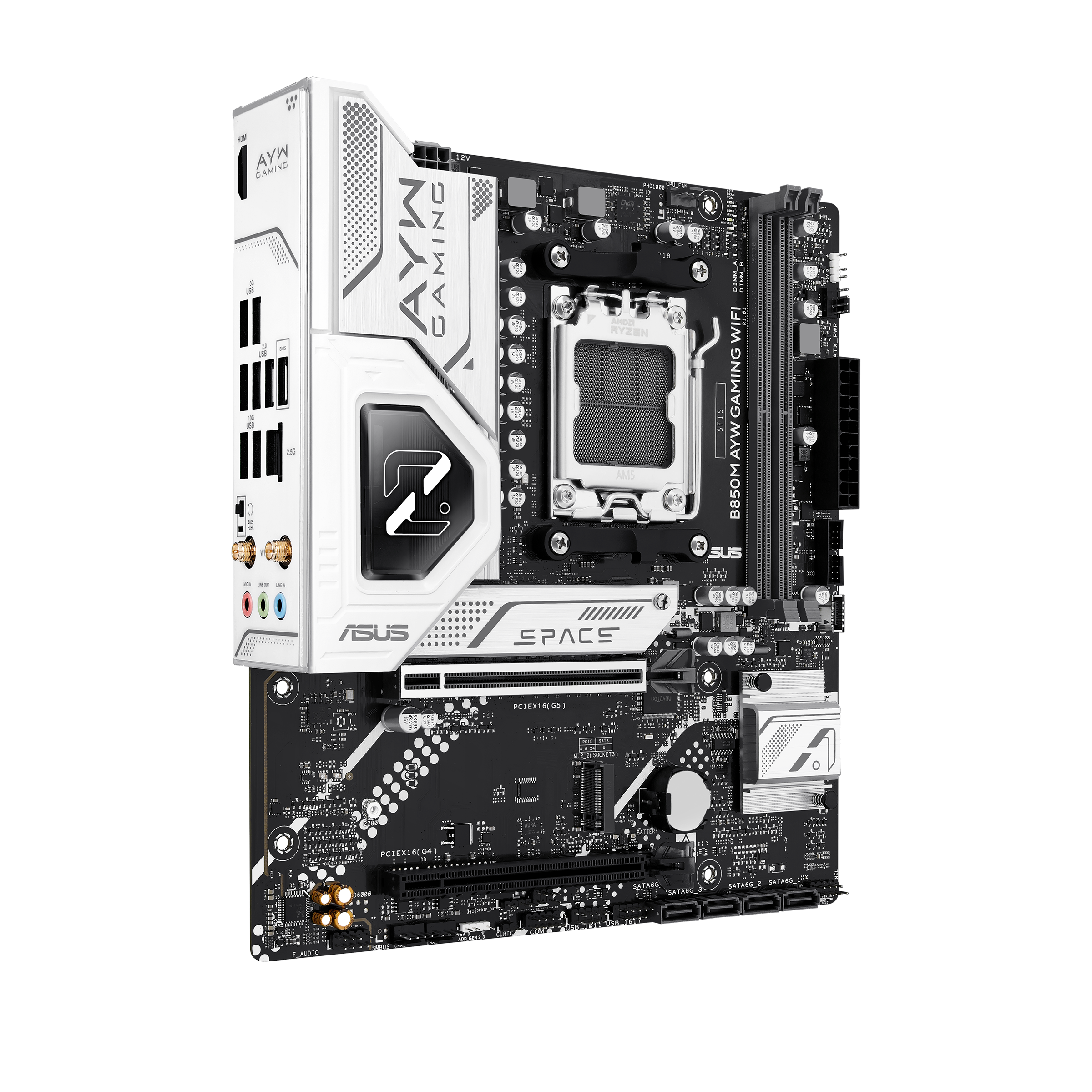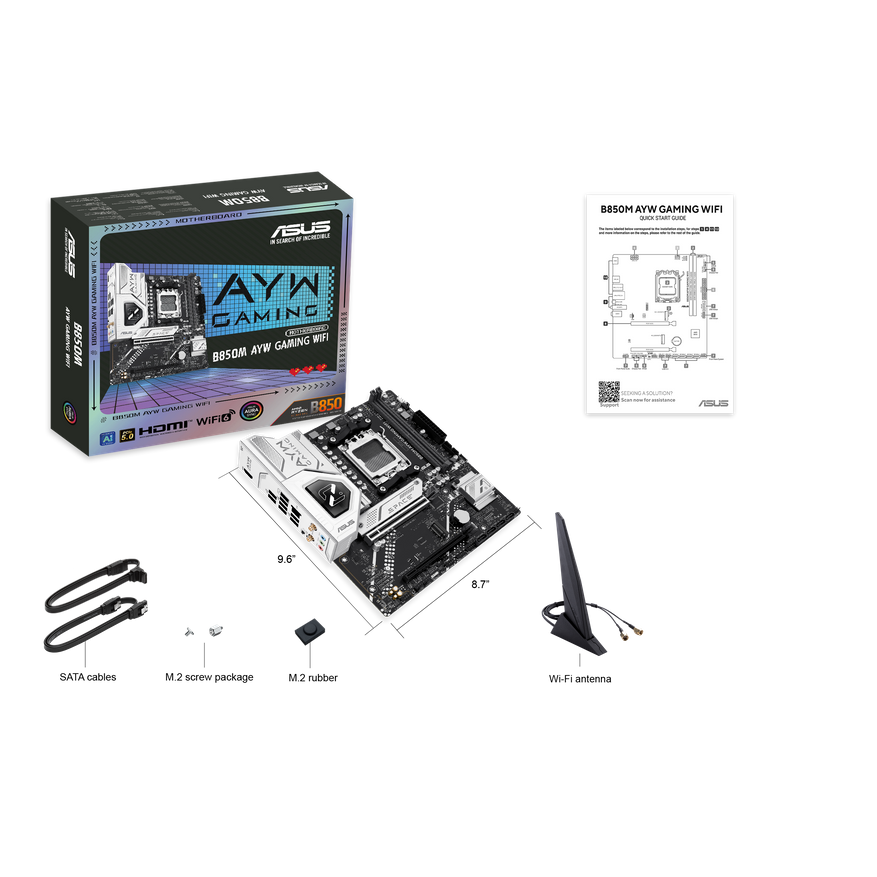 Компания ASUS представила на своем официальном сайте материнскую плату B850M AYW GAMING WIFI в форм-факторе Micro-ATX (221x244 мм), ориентированную на компактные игровые сборки. Модель продолжает серию «AYW» с космической тематикой, выделяясь чёрной текстолированной основой и минималистичными серебристыми элементами бронирования.