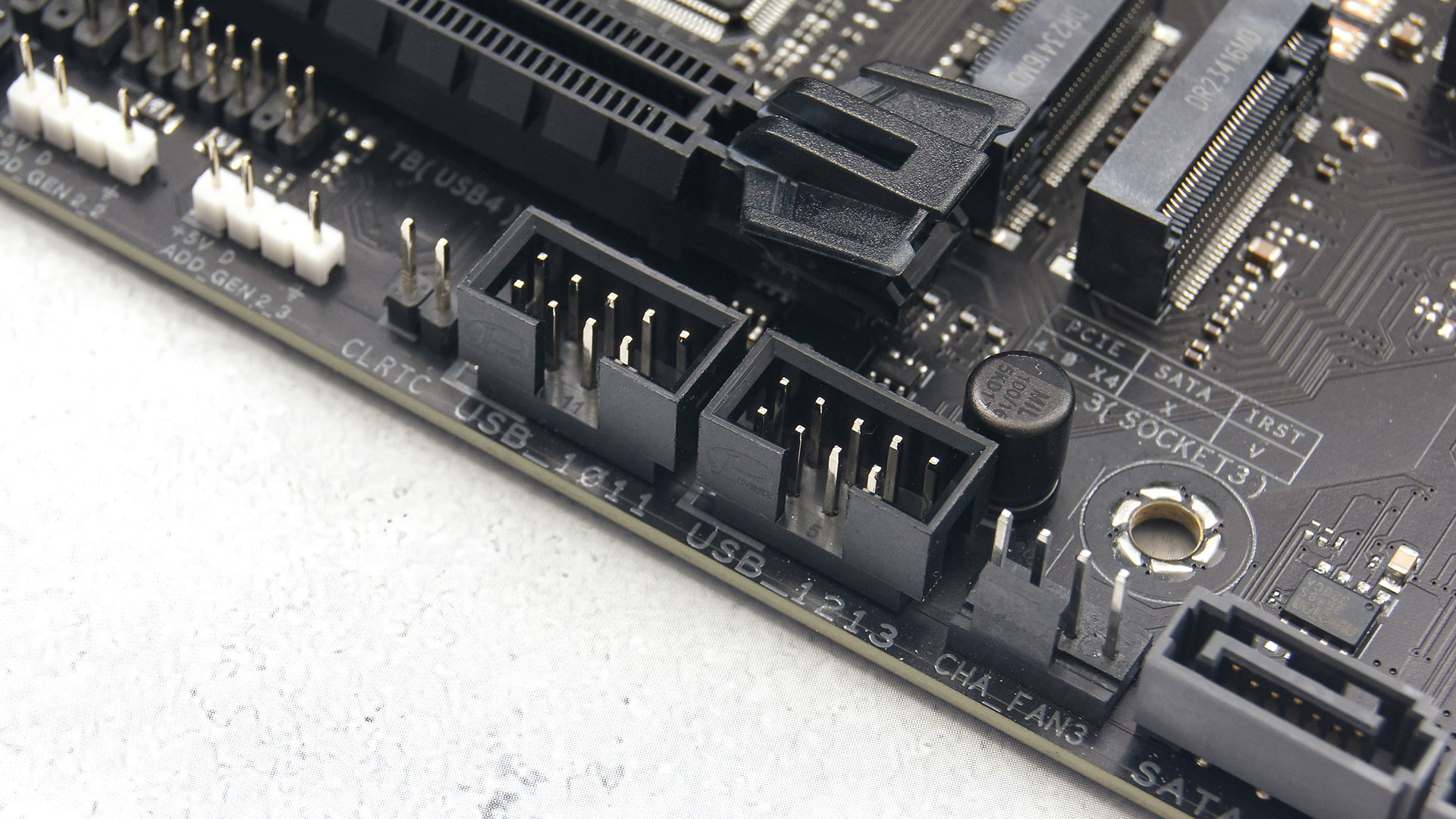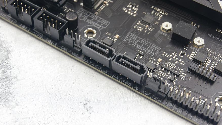Помимо четырех разъемов M.2 дисковая подсистема TUF Gaming Z790-Pro WIFI имеет еще четыре SATA-разъема. Два из них расположены у правого края рядом с чипсетом и еще два у нижнего края ближе к правому углу.