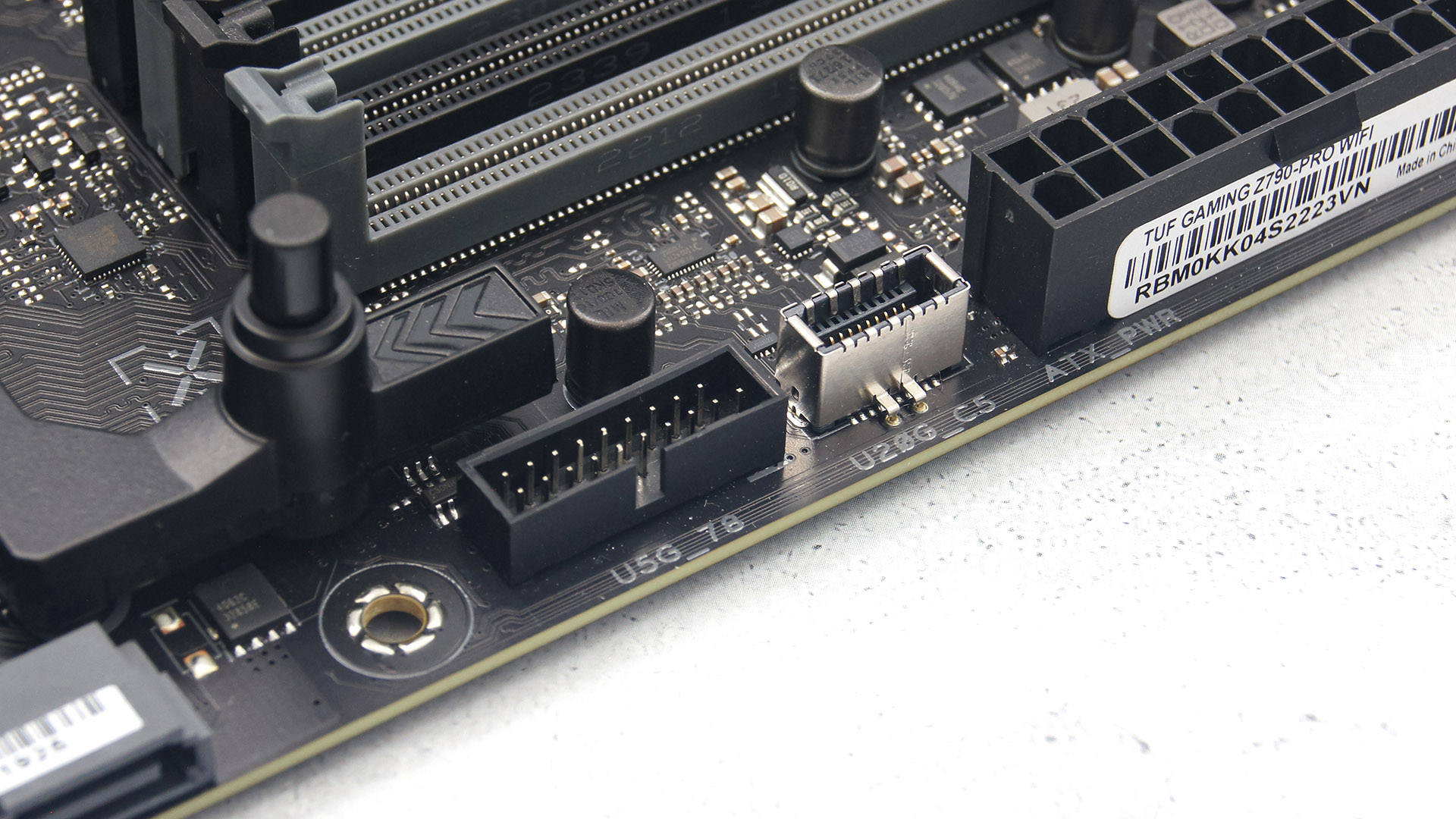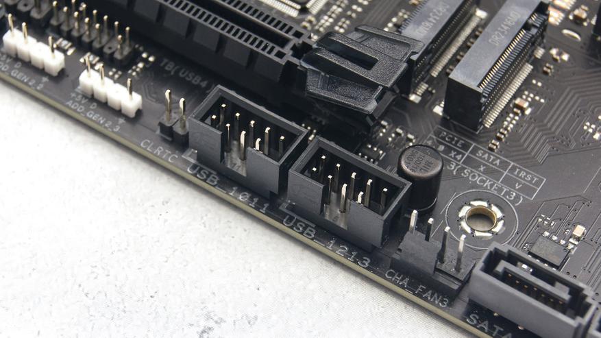Колодки для подключения корпусных USB у платы TUF Gaming Z790-Pro WIFI представлены полным составом: пара для USB 2.0 (4 разъема), одна для USB 3.2 Gen1 и одна USB 3.2 Gen2x2 (Type-C).