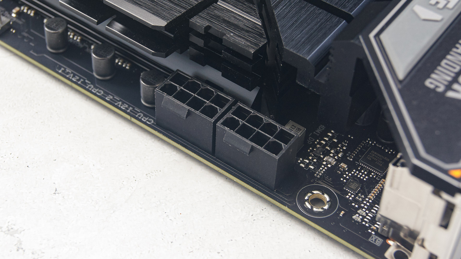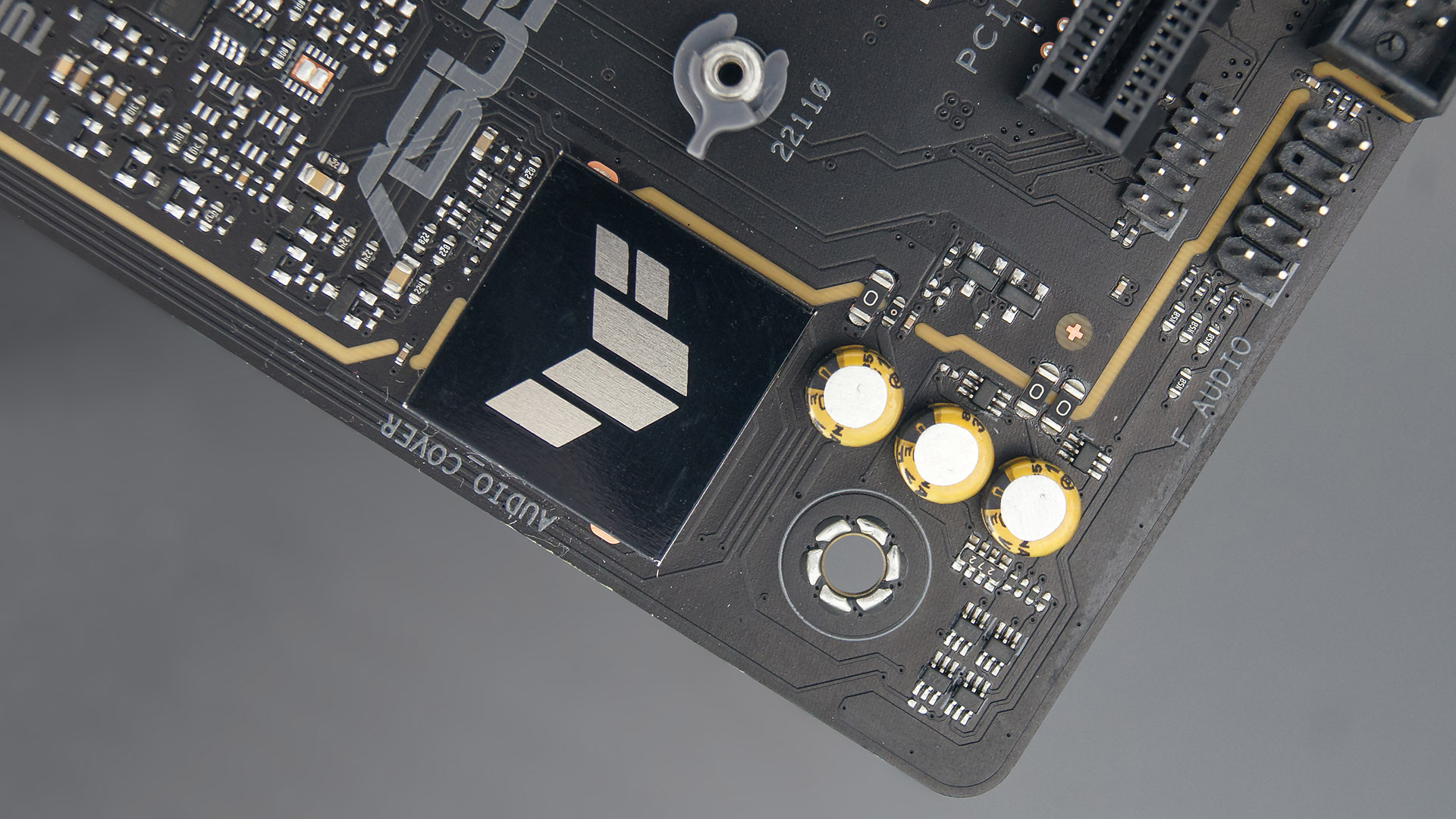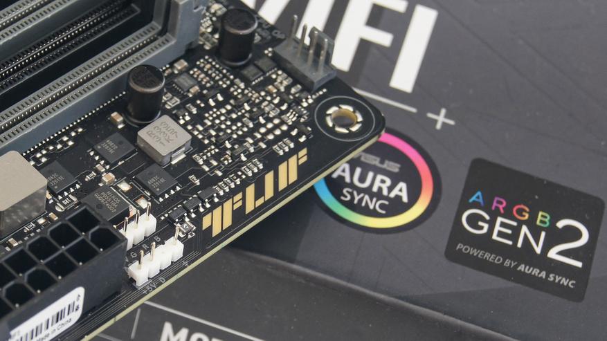 В качестве основы аудиоподсистемы выступает чип Realtek S1220A. Увидеть сам чип не получится — он прикрыт колпачком с логотипом TUF. Рядом с ним можно заметить три небольших конденсатора золотисто-черного окраса производства Elna.