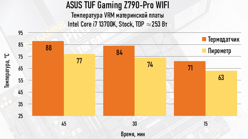 Спустя 15 минут после начала стресс-теста температурный датчик VRM показывал значение 71 °C. Самая горячая точка поверхности радиаторов в этот момент была 63 °C (измерено пирометром). Спустя 45 минут с момента старта стресс-теста температурный датчик VRM показывал уже 88 °C, а самая горячая точка на поверхности радиаторов разогрелась до 77°C. Здесь стоит уточнить момент, что никакого даже малейшего обдува материнской платы не производилось, а находилась она в горизонтальном положении, что, учитывая расположение конфигурацию оребрения радиаторов, не самое лучшее положение для естественной конвекции воздуха. К тому же, с СЖО нет никакого движения воздуха в околосокетном пространстве, которое было бы при использовании даже башенного кулера. В реальных условиях, будучи установленной в корпус с минимальной принудительной вентиляцией, VRM материнской платы ASUS TUF Gaming Z790-Pro WIFI будет холоднее.