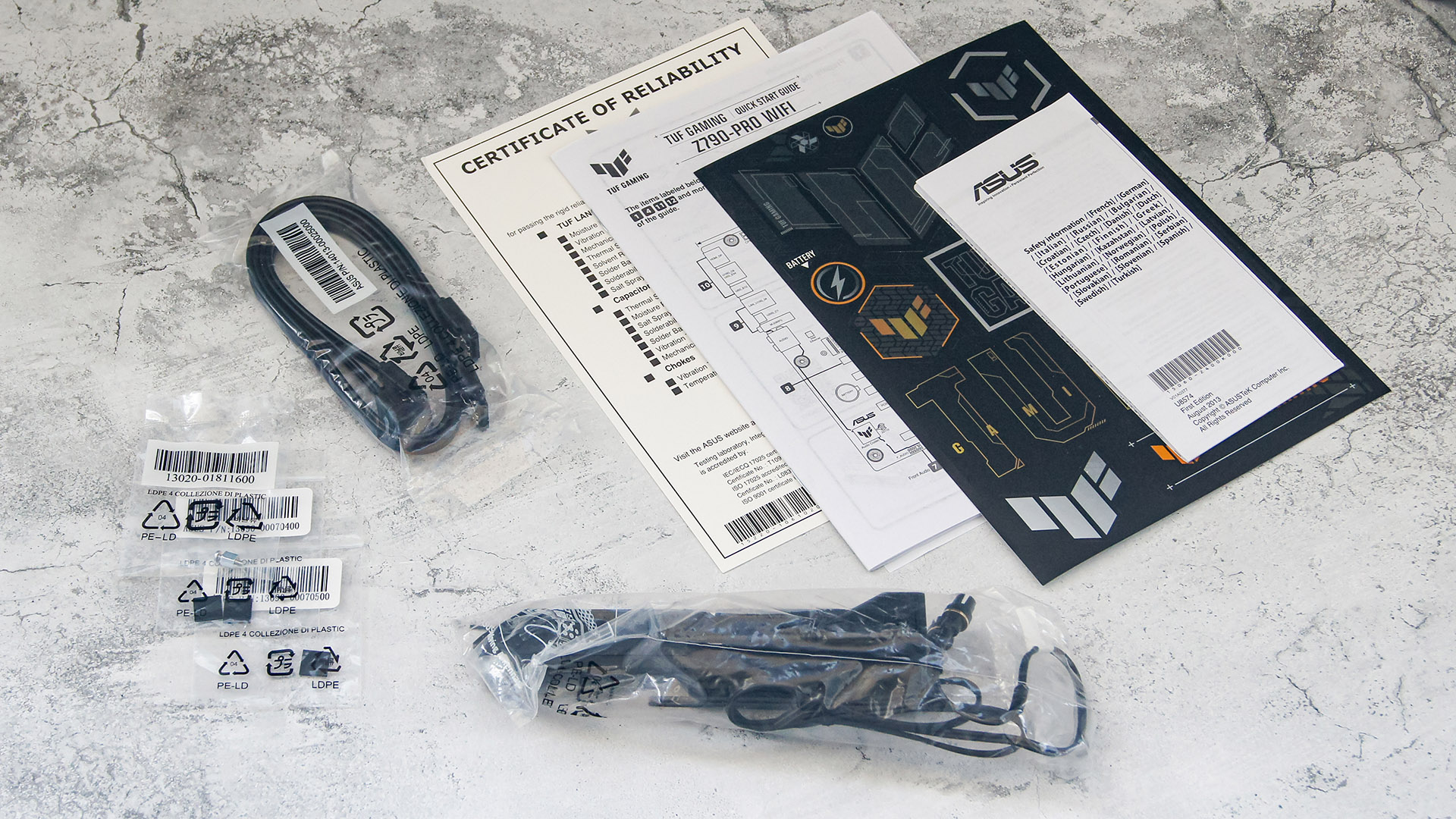 Ничего необычного здесь нет: документация с листом стикеров, SATA-кабели, крепеж для M.2-накопителей да WI-Fi антенна.