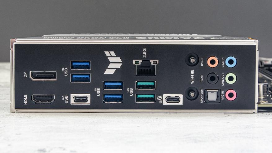 Порты (задней) панели ввода-вывода представлены широким набором быстрых USB. Только USB-C здесь два штуки: один USB 3.2 Gen2x2 (до 20 Гбит/с) и один USB 3.2 Gen2 (до 10 Гбит/с). Последний интерфейс представлен еще и парой USB-A — зеленого цвета. Также присутствует квартет из обычных синих USB 3.2 Gen1 (до 5 Гбит/с). Старым добрым USB 2.0 здесь места не нашлось.