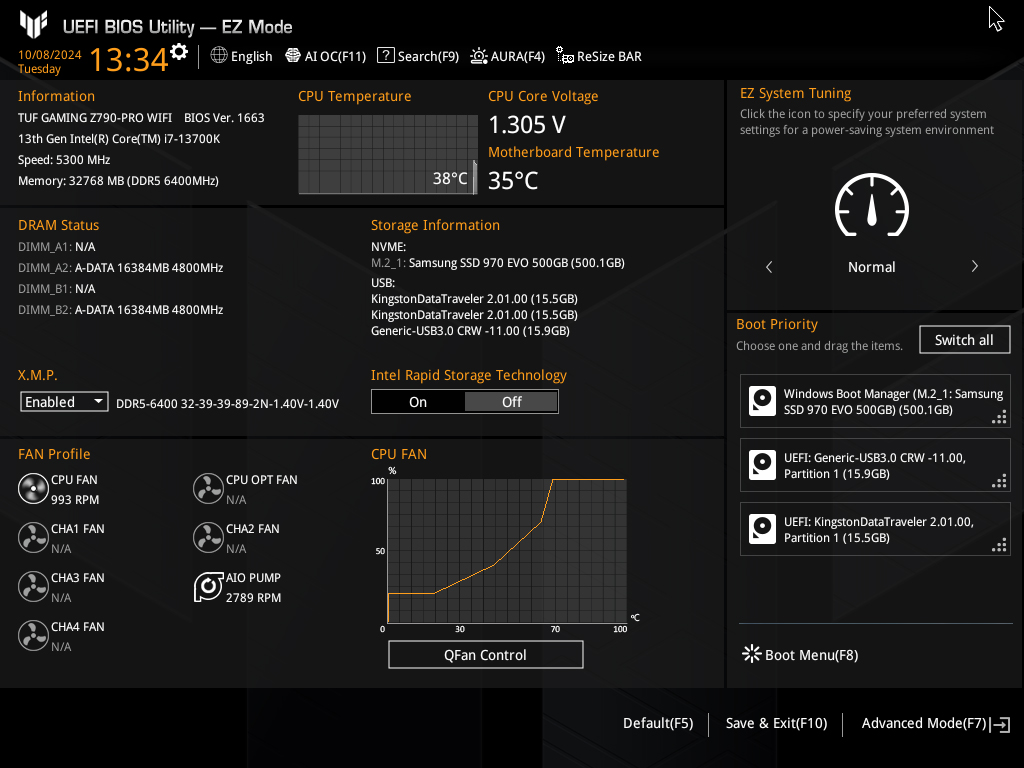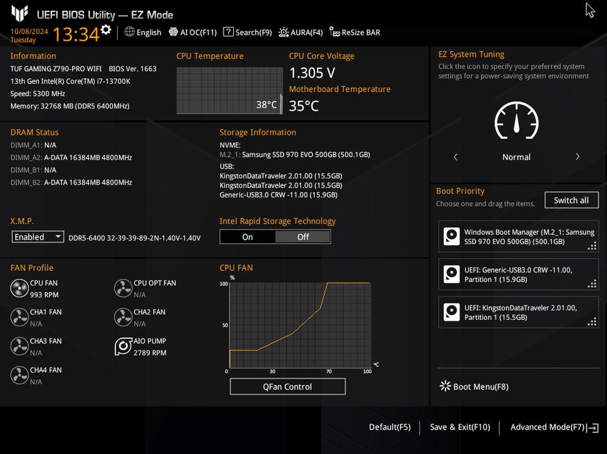 ASUS TUF Gaming Z790-Pro WIFI мне понравилась. Это плата с приличным обвесом, но без излишеств. При этом есть все что может понадобиться при сборке ПК любой конфигурации и назначения. Z-чипсет это конечно больше для тех, кто любит поковыряться в настройках BIOS, покрутить циферки, погонять бенчмарки, но этим старший чипсет не ограничивается. Тут вам и целых четыре M.2-разъема для SSD, и охапка USB, в том числе и скоростные USB 3.2 Gen2x2. Ну и один из главных моментов — мощная система питания, которая без проблем вывозит i7-13700K под Prime95, а это очень серьезная нагрузка, которая не встречается в реальных сценариях.
