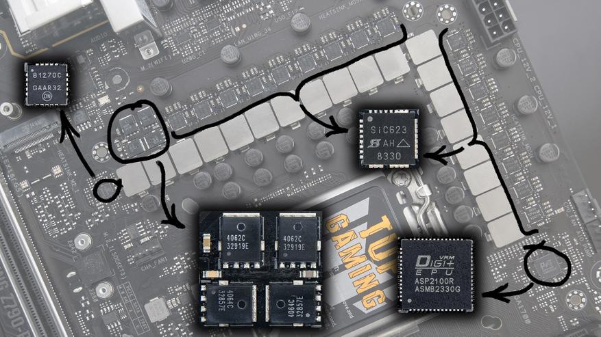 Схему питания процессора у платы ASUS TUF Gaming Z790-Pro WIFI можно обозначить как 16+1+2. Фазы VCore и iGPU (16+1) представлены сборками Vishay SiC623 (60 А), которые подчиняются контроллеру Digi+ ASP2100. Фазы VCCIO (2) набраны парами из 4062C и 4064C и подчиняются OnSemi NCP81270C.