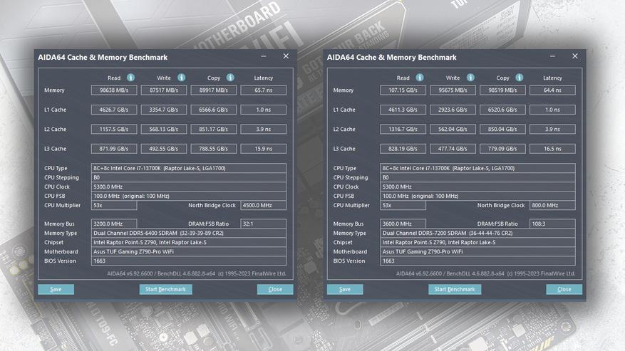 Разгон оперативной памяти на этой плате можно назвать успешным. Так, Комплект ADATA XPG Lancer Blade RGB 2x16 ГБ (AX5U6400C3216G-DTLABRBK) со встроенным профилем XMP 6400 МГц при CL32 на плате TUF Gaming Z790-Pro WIFI запустился и бесперебойно работал на частоте 7200 МГц при CL36. Причем много времени настройке таймингов и подбору напряжений я не уделял. Этот же комплект памяти на материнской плате MSI PRO B650M-P вообще не удалось заставить работать на частоте 7200 МГц.